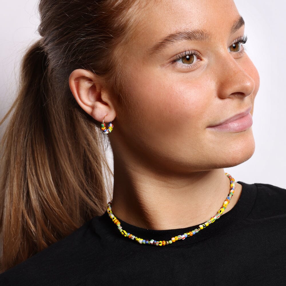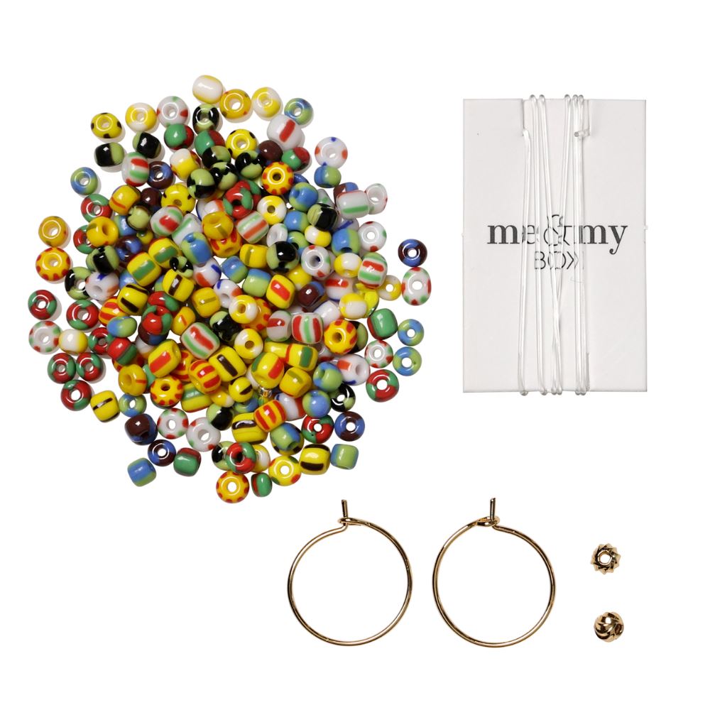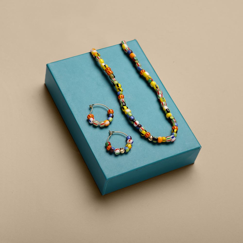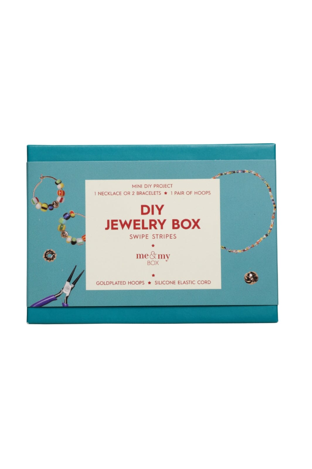 Zielona skrzynka na biżuterię DIY od Me & My Box z materiałami do stworzenia naszyjnika lub dwóch bransoletek. Skrzynka zawiera koraliki, kamienie i elementy biżuteryjne oraz parę kółek z pozłacanego mosiądzu.