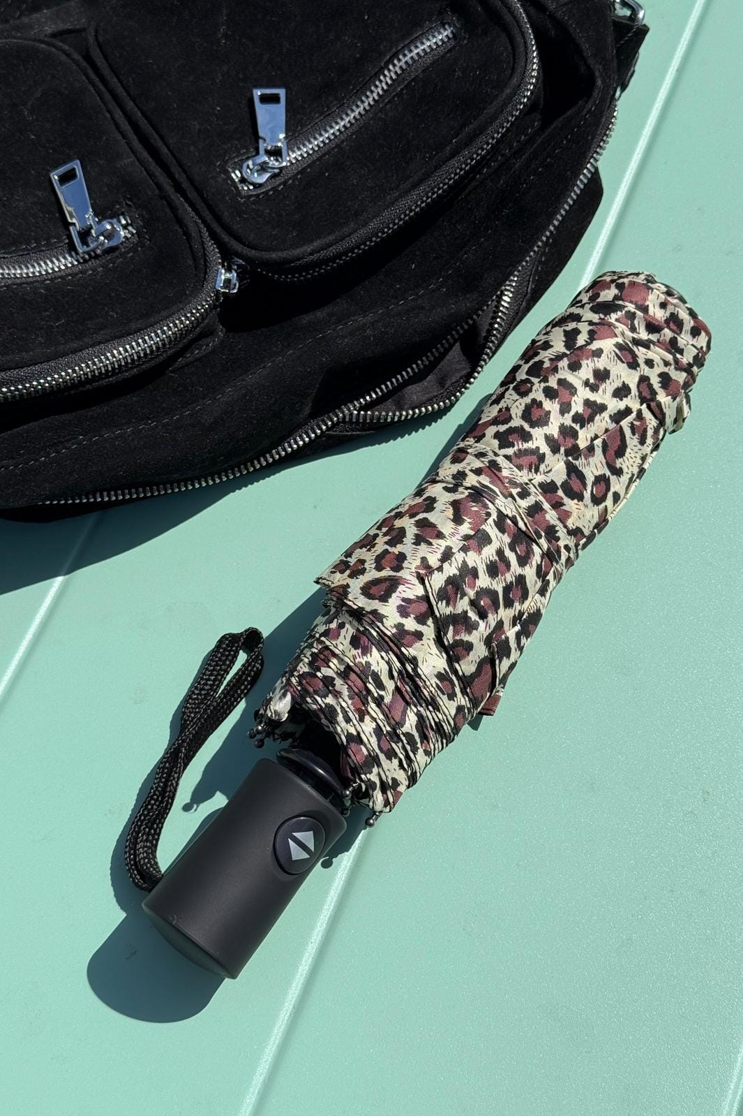 Składany parasol od Mellow Moon w brązowy wzór w panterkę. Parasol ma kompaktowy design, co ułatwia jego noszenie w torbie.