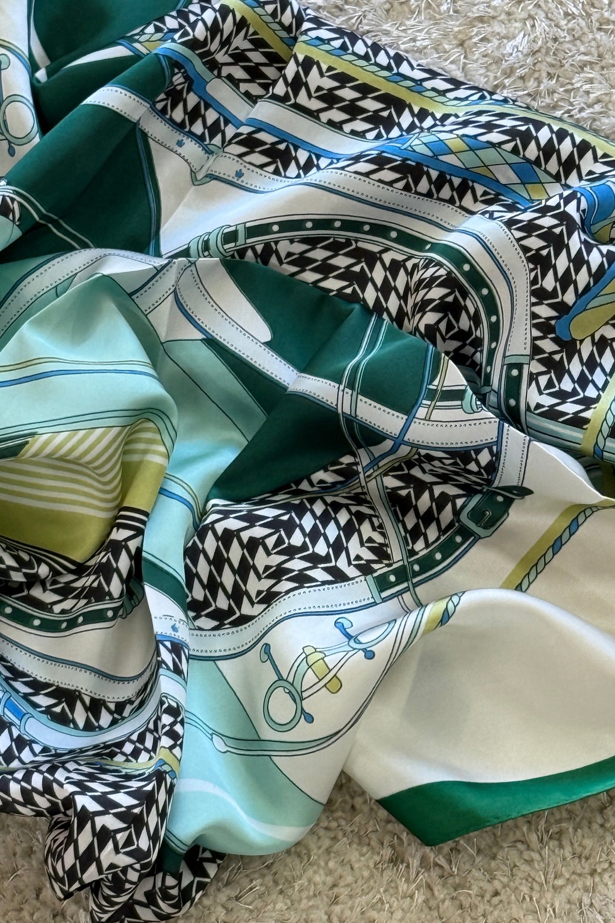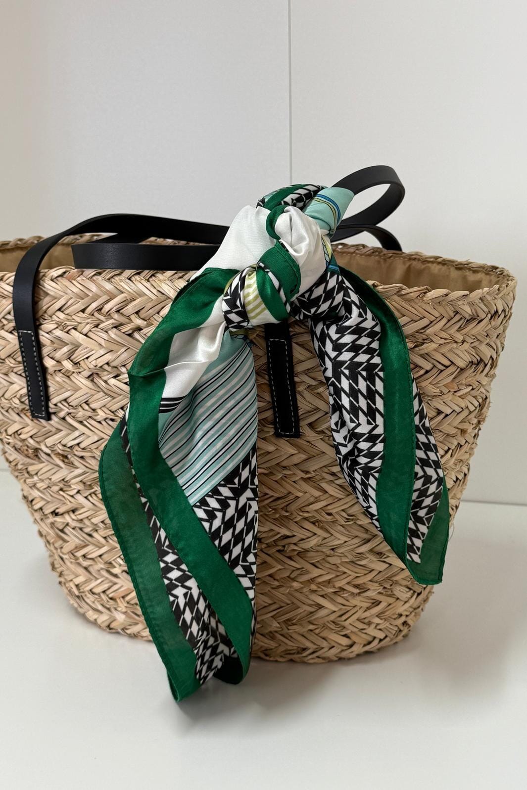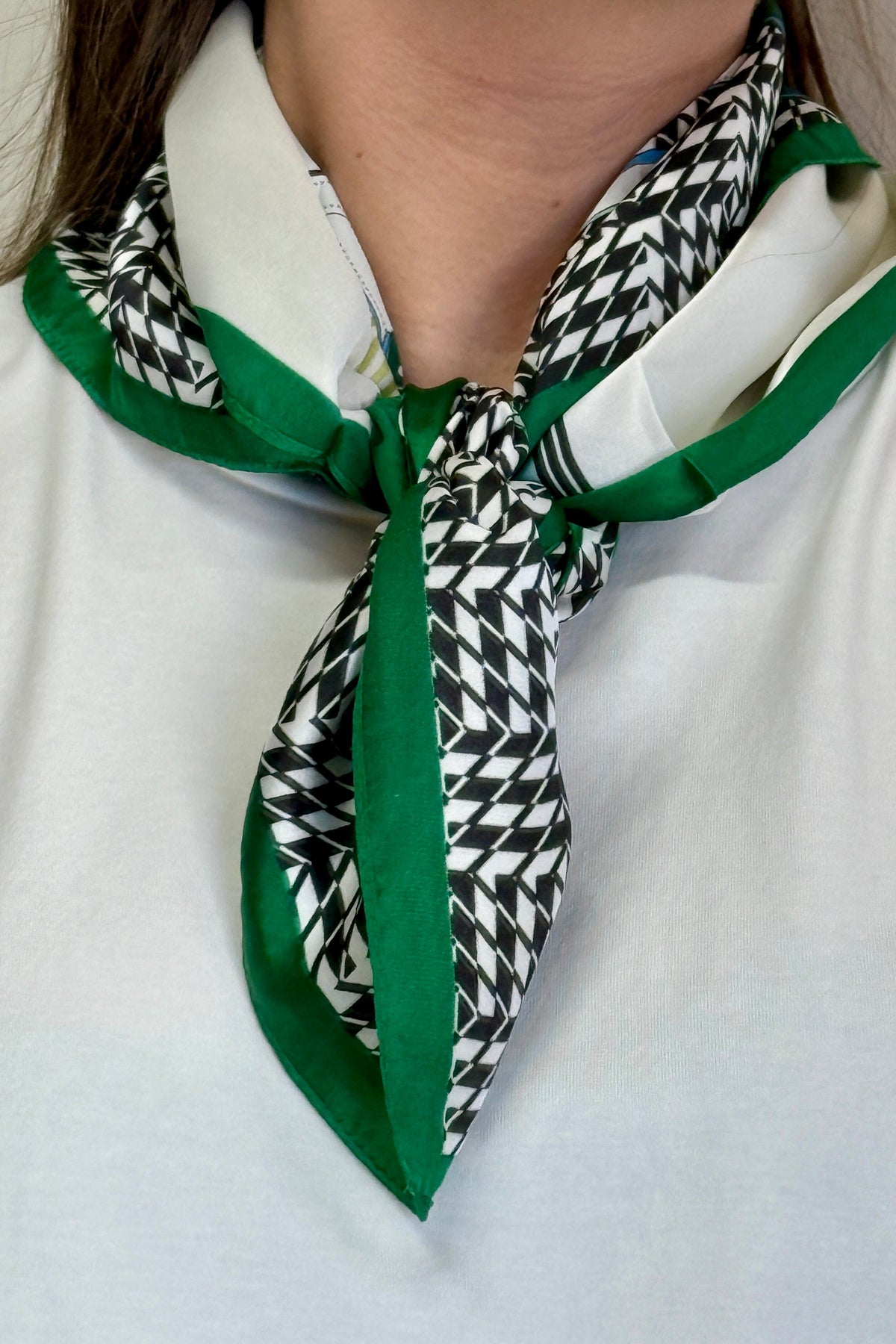 Szalik od Mellow Moon z geometrycznym wzorem w zieleni, czerni i bieli. Szalik można nosić zarówno na szyi, jak i jako ozdobę na torbach.