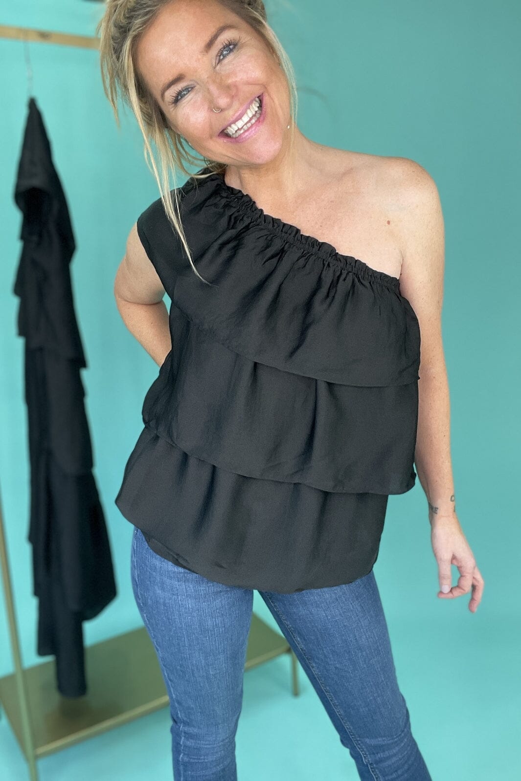 Czarny top od Mellow Moon z projektem na jedno ramię i detalami w falbanki. Top ma warstwy falbanek, które nadają ruchu projektowi, oraz elastyczny brzeg, który utrzymuje go na miejscu.