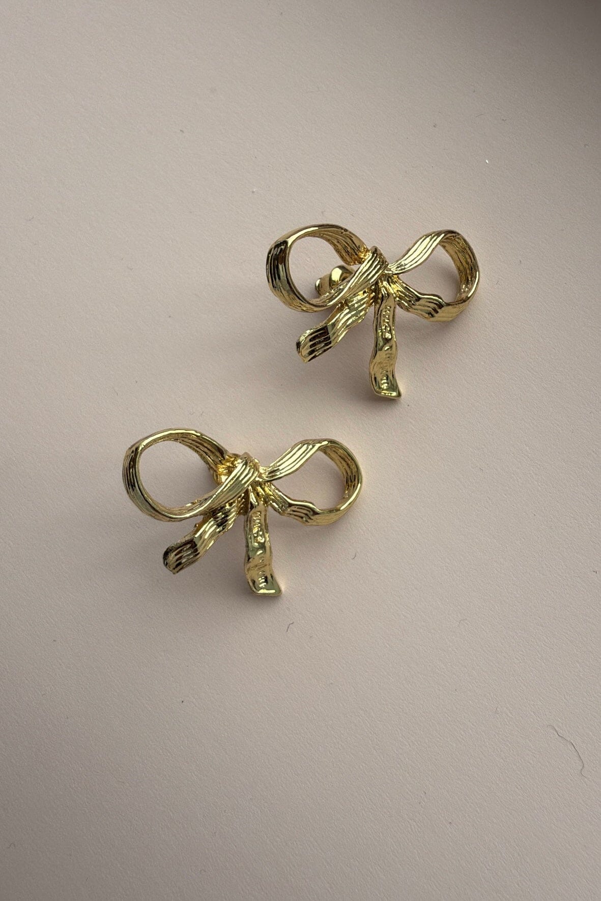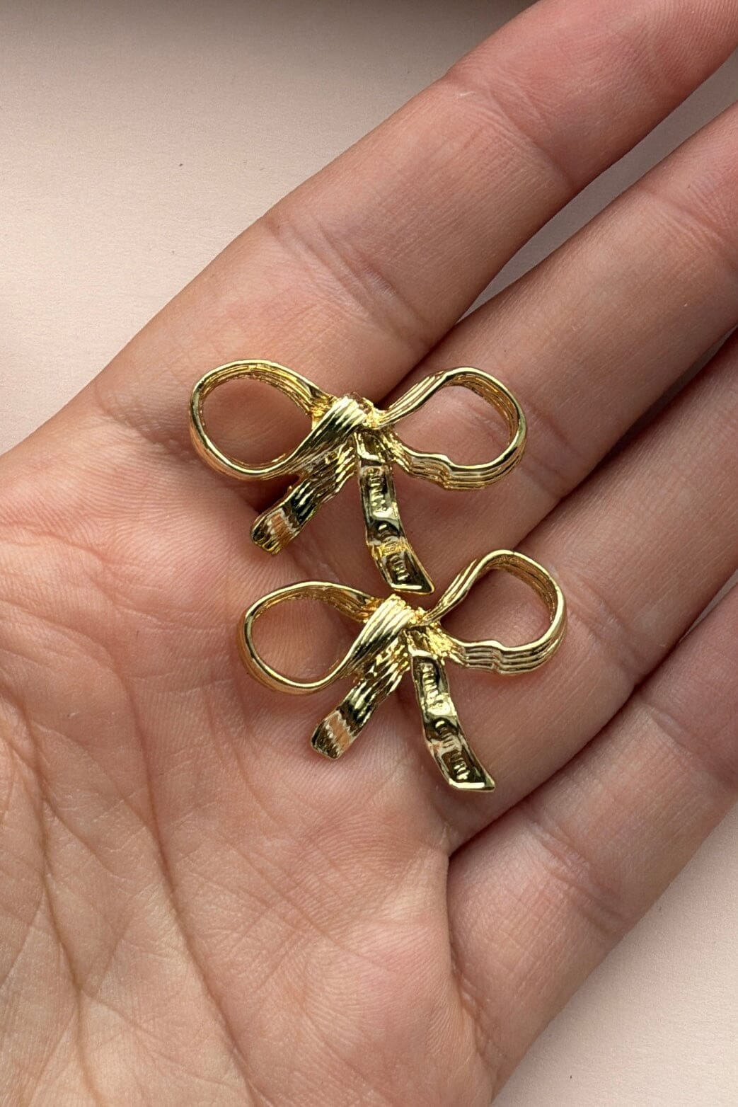 Kolczyki w kształcie kokardek od Mellow Moon z złotą powierzchnią. Małe kokardki mają szczegółową teksturę i finezyjny kształt, który można nosić zarówno na co dzień, jak i na specjalne okazje.