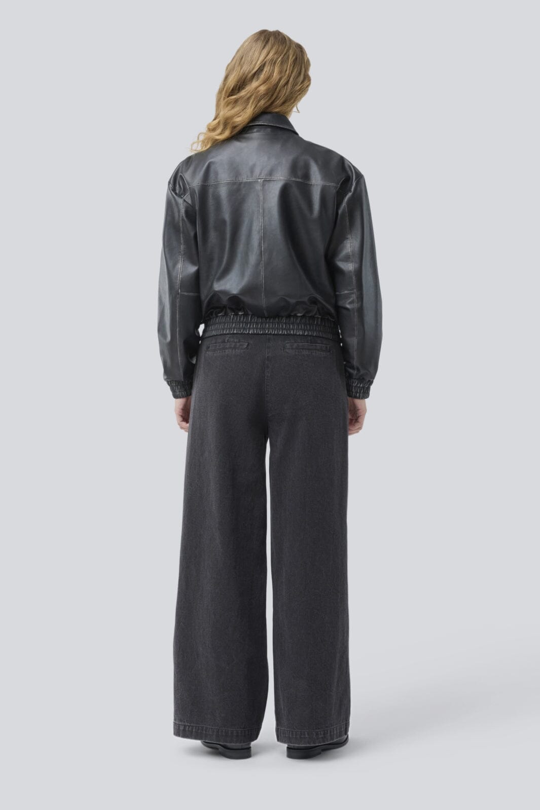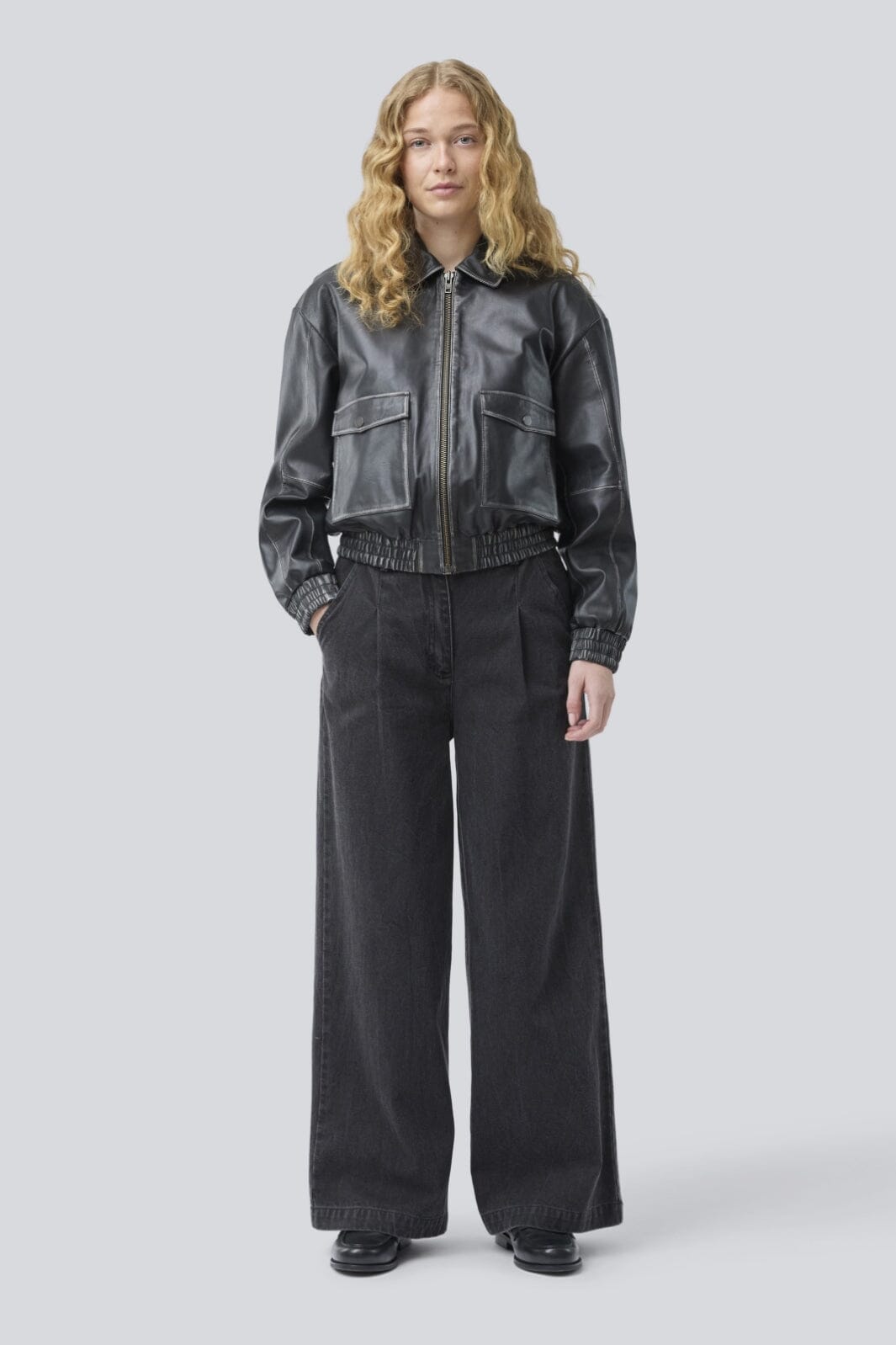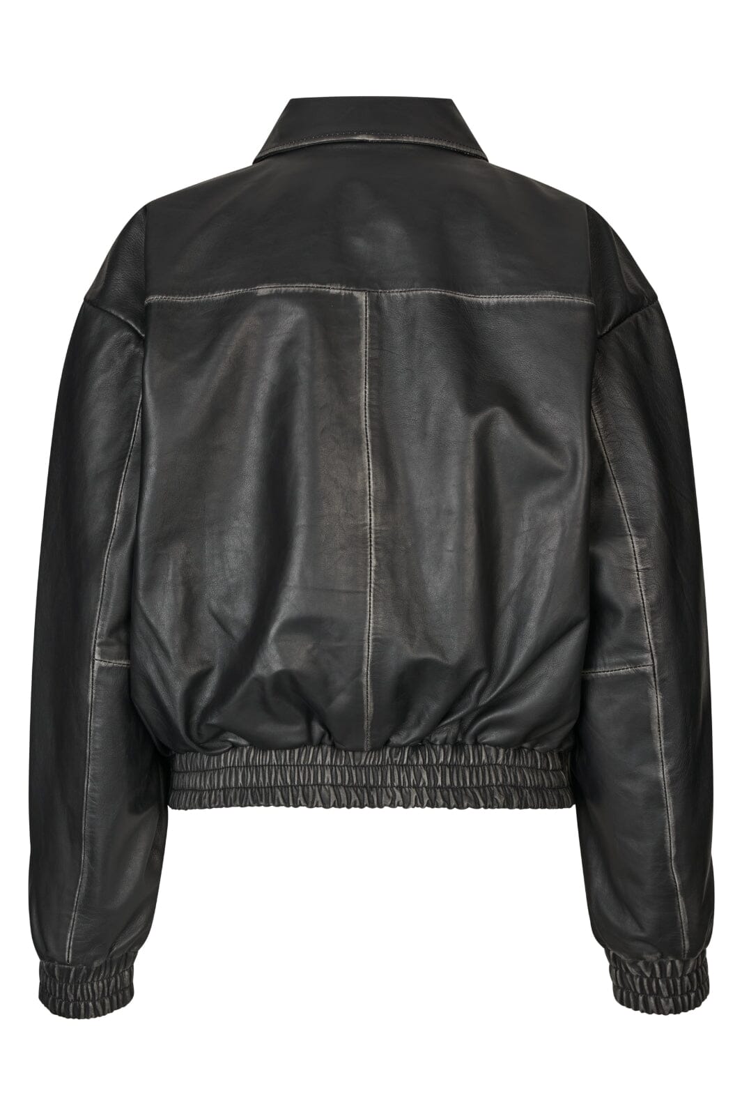 Czarna skórzana kurtka od Modström z kołnierzykiem koszulowym i zamkiem błyskawicznym z przodu. Kurtka ma luźny krój i dwie duże przednie kieszenie z zapięciem na guzik z przodu.
