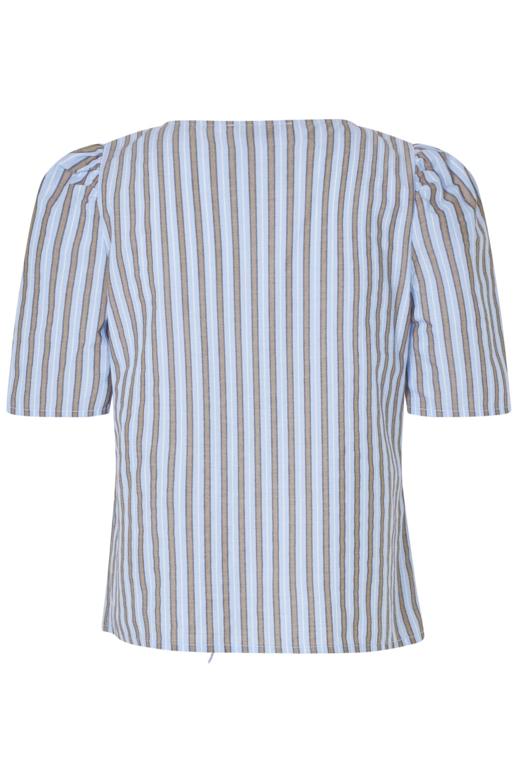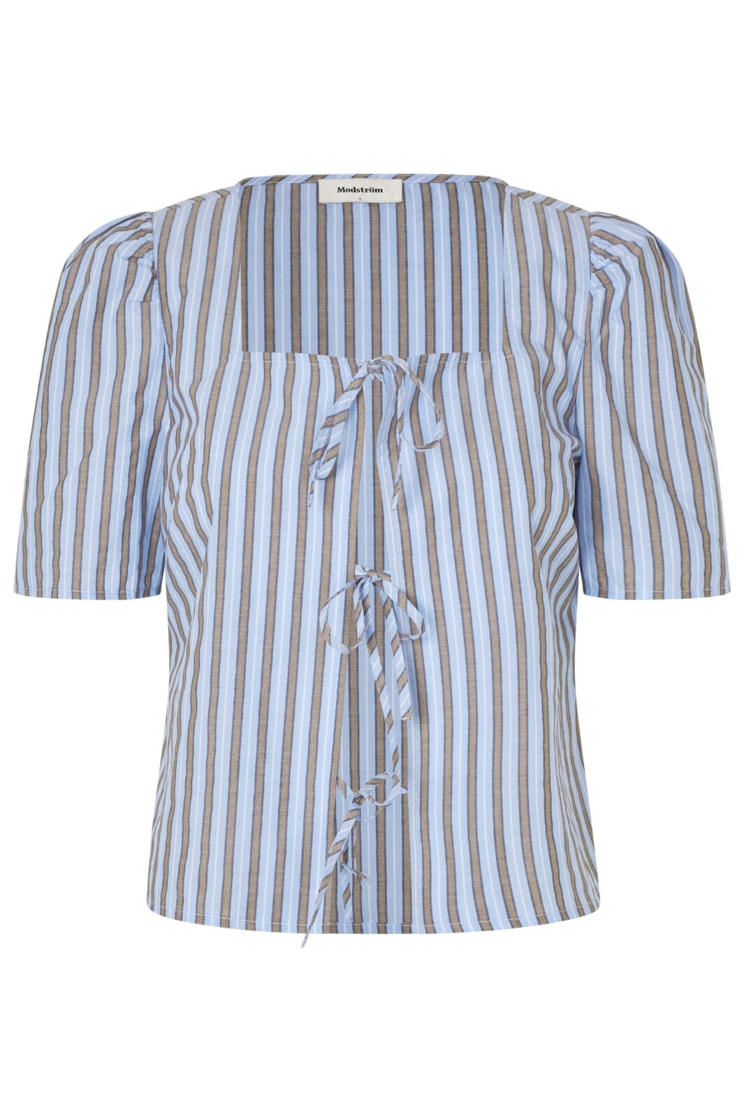 Stripowana bluzka od Modström z krótkimi rękawami i kwadratowym dekoltem. Bluzka ma niebieskie i brązowe paski oraz detal sznurowania na środku.