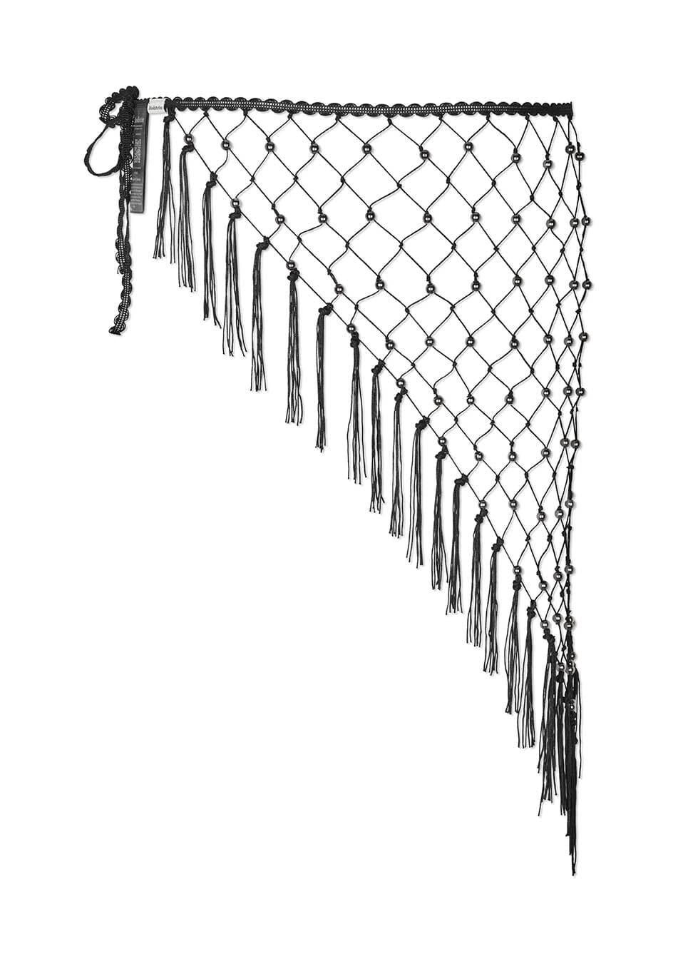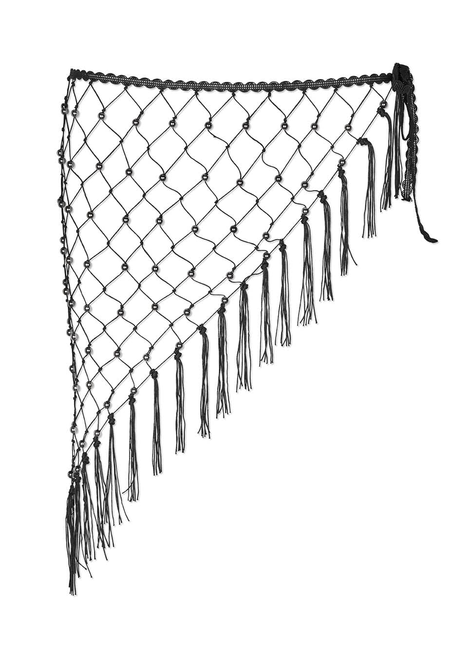 Czarny szal w talii od Modström, wykonany z nylonu. Szal ma perełkopodobne zdobienia w kwadratowym wzorze oraz frędzle wzdłuż krawędzi.