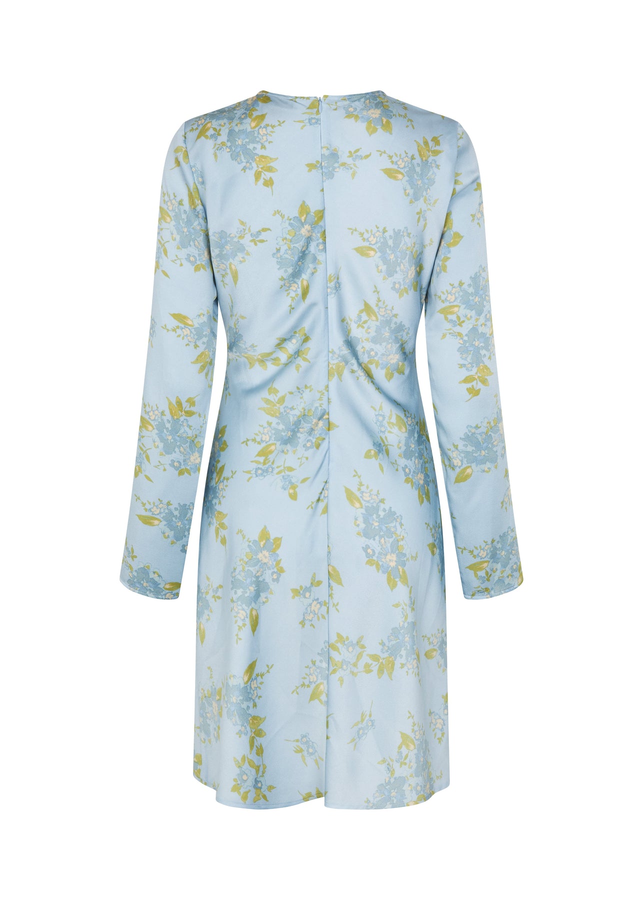 Sukienka z nadrukiem od Modström, wykonana w 100% z poliestru z recyklingu w jasnoniebieskim kolorze z kwiatowym wzorem w żółtych i niebieskich odcieniach.