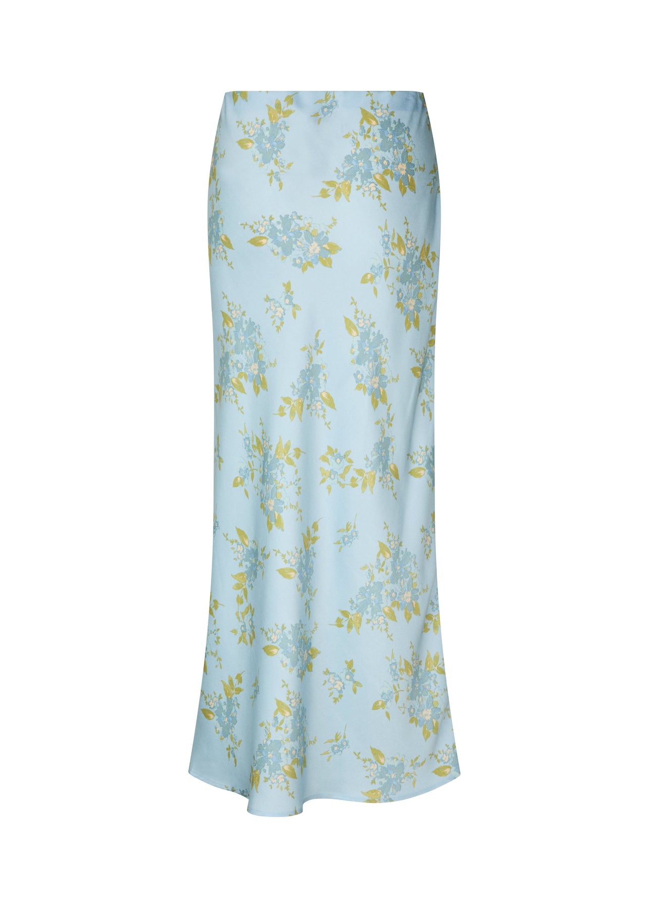 Długa spódnica marki Modström z romantycznym kwiatowym nadrukiem w żółtych i niebieskich odcieniach na jasnoniebieskim tle. Spódnica odpowiednia zarówno na specjalne okazje, jak i na co dzień.