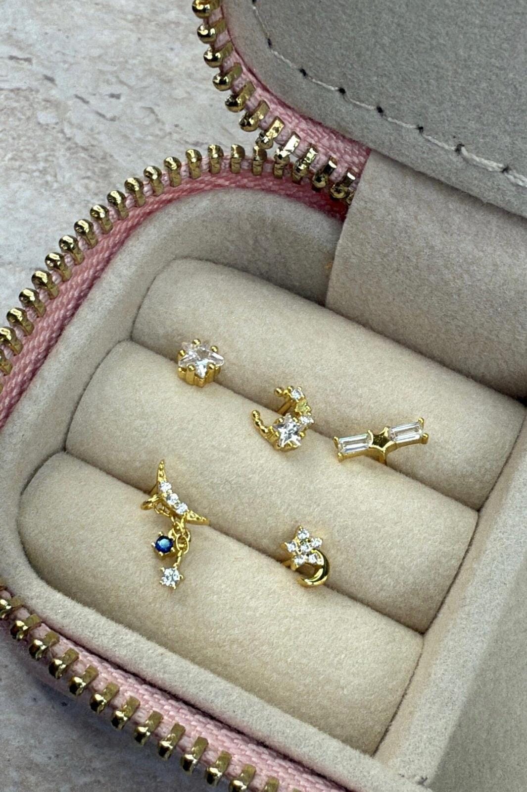 Kolczyki Molly&My Jewellery wykonane ze stali nierdzewnej z pozłacanym srebrnym wykończeniem. Biżuteria ma złote detale oraz kamienie w różnych kształtach.