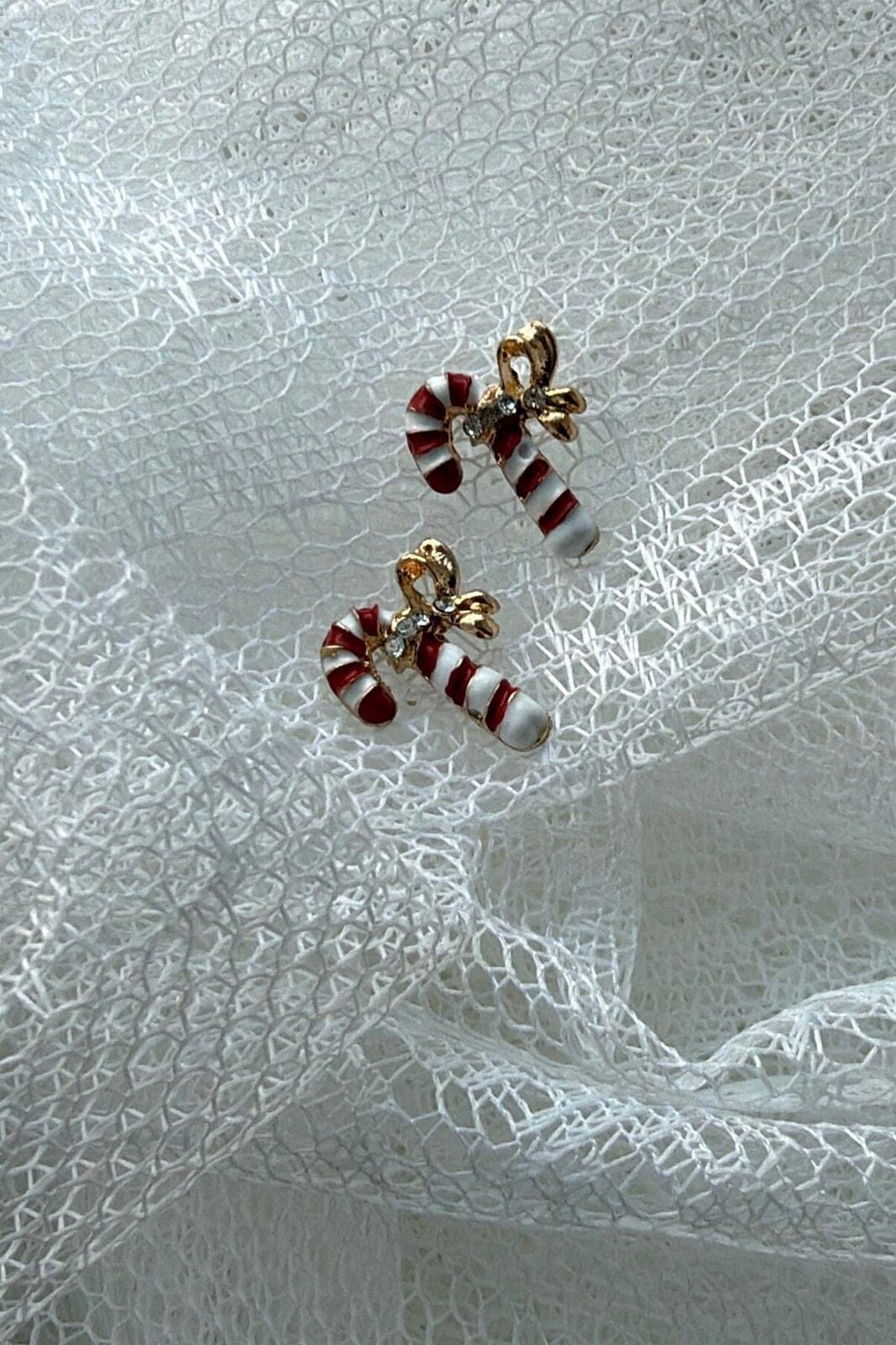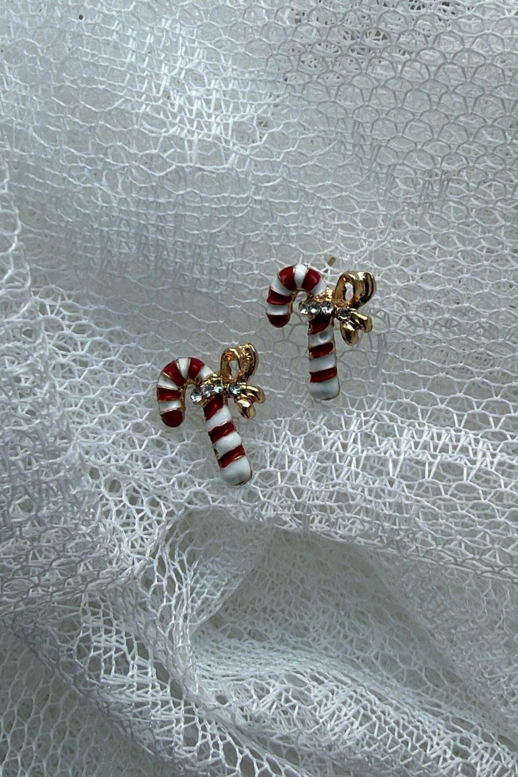 Kolczyki Molly&My Jewellery zaprojektowane w kształcie lasek cukrowych z czerwonymi i białymi paskami. Mają małą złotą kokardkę i przezroczysty kamień.