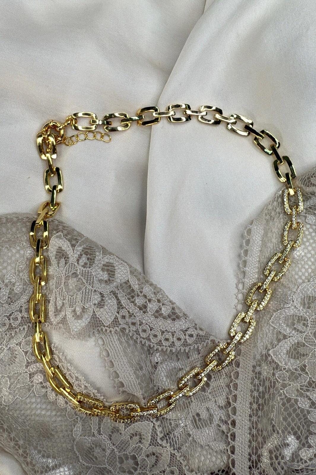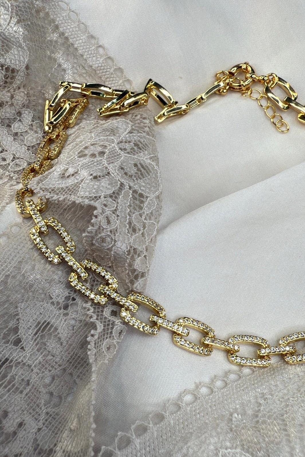 Pozłacany naszyjnik Molly&My Jewellery z prostokątnymi ogniwami łańcuszka. Niektóre ogniwa są ozdobione małymi, błyszczącymi kamieniami. Łańcuszek ma regulowane zapięcie.