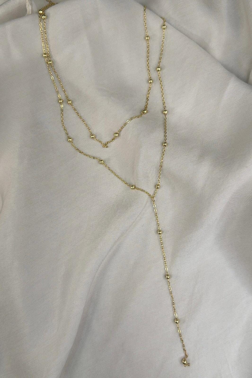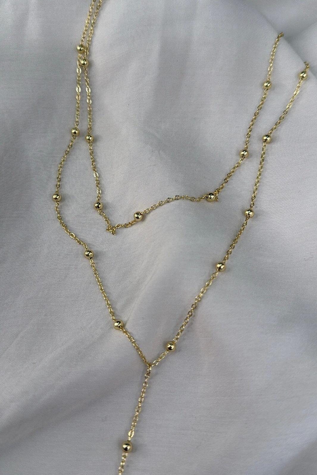 Pozłacany naszyjnik Molly&My Jewellery z małymi kuleczkami rozmieszczonymi wzdłuż łańcuszka. Projekt ma kilka warstw i strukturę w kształcie litery Y.