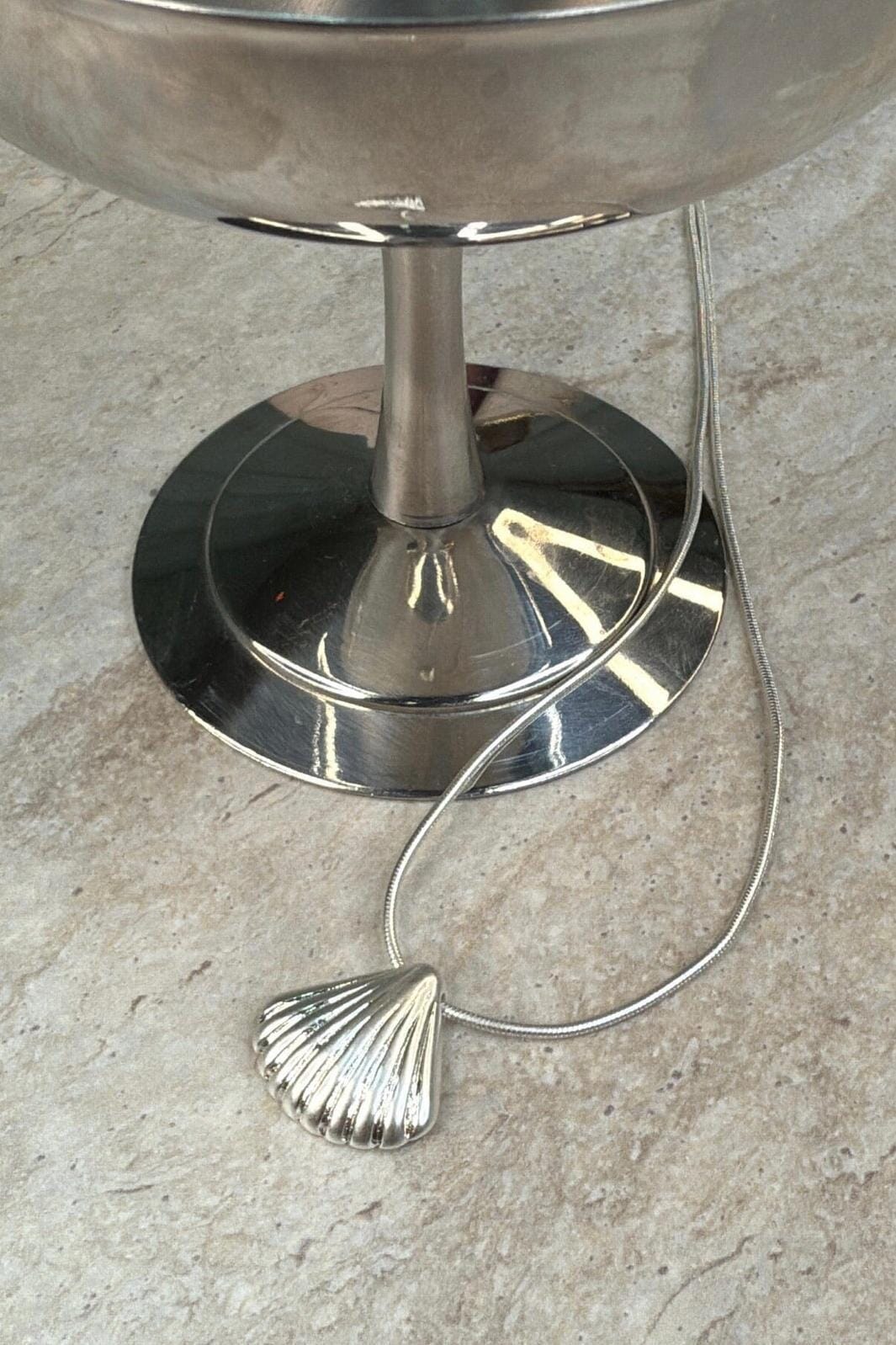 Srebrzony naszyjnik od Molly&My Jewellery z zawieszką w kształcie muszli. Naszyjnik ma łańcuszek typu snake oraz żłobioną strukturę na zawieszce.