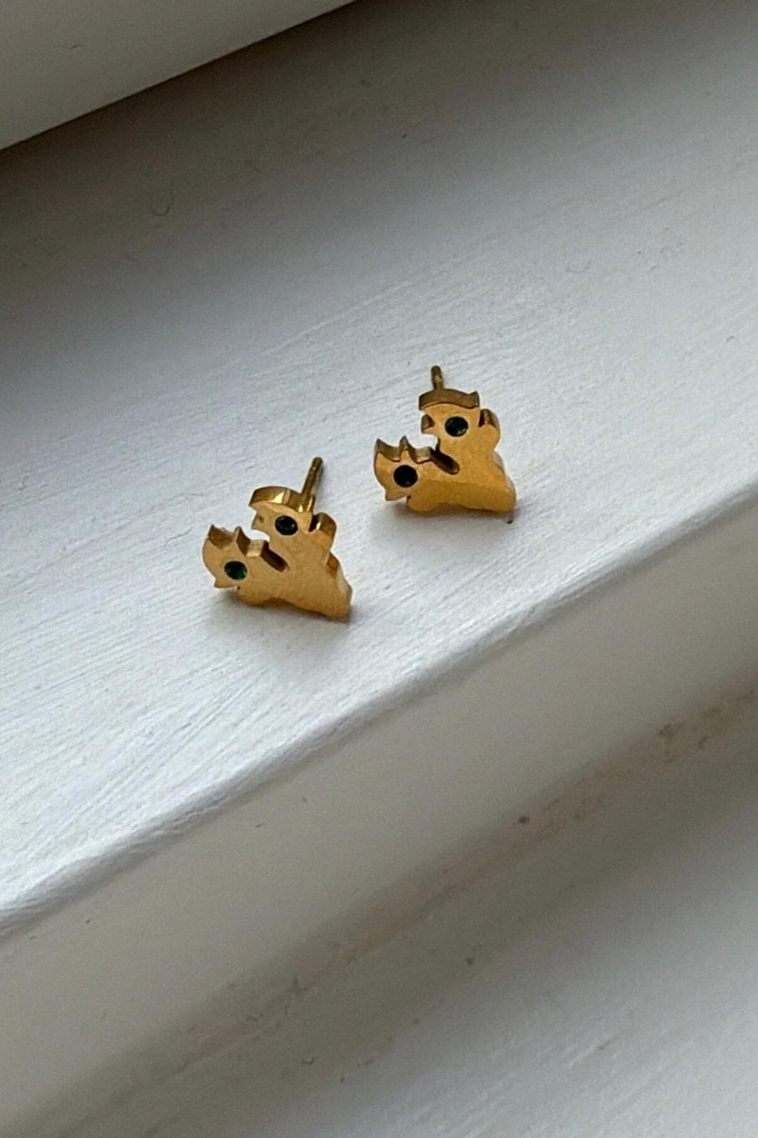 Kolczyki sztyfty Molly&My Jewellery z abstrakcyjnym wzorem w złocistym wykończeniu. W każdy kolczyk wprawiono małe zielone kamienie.