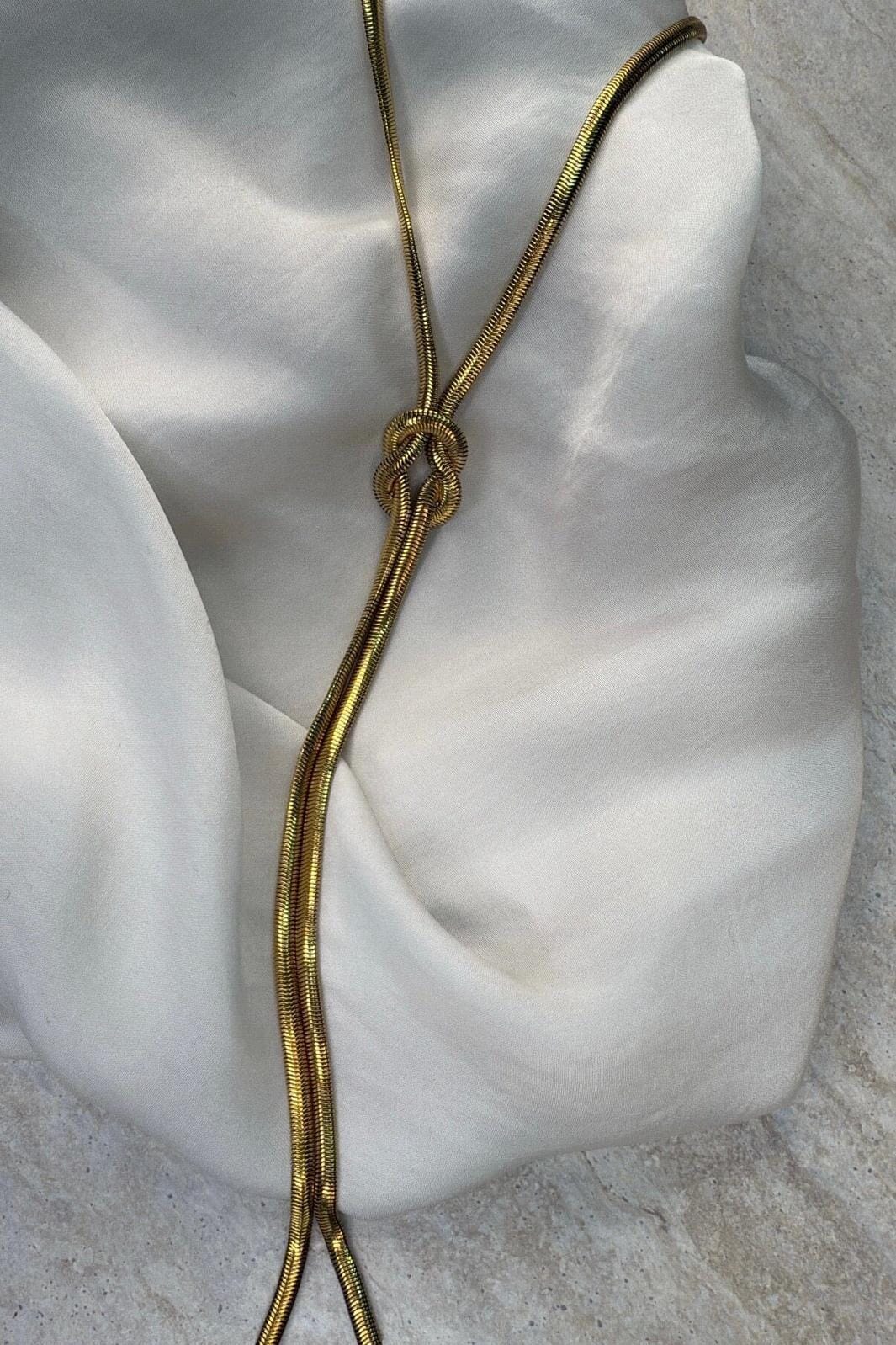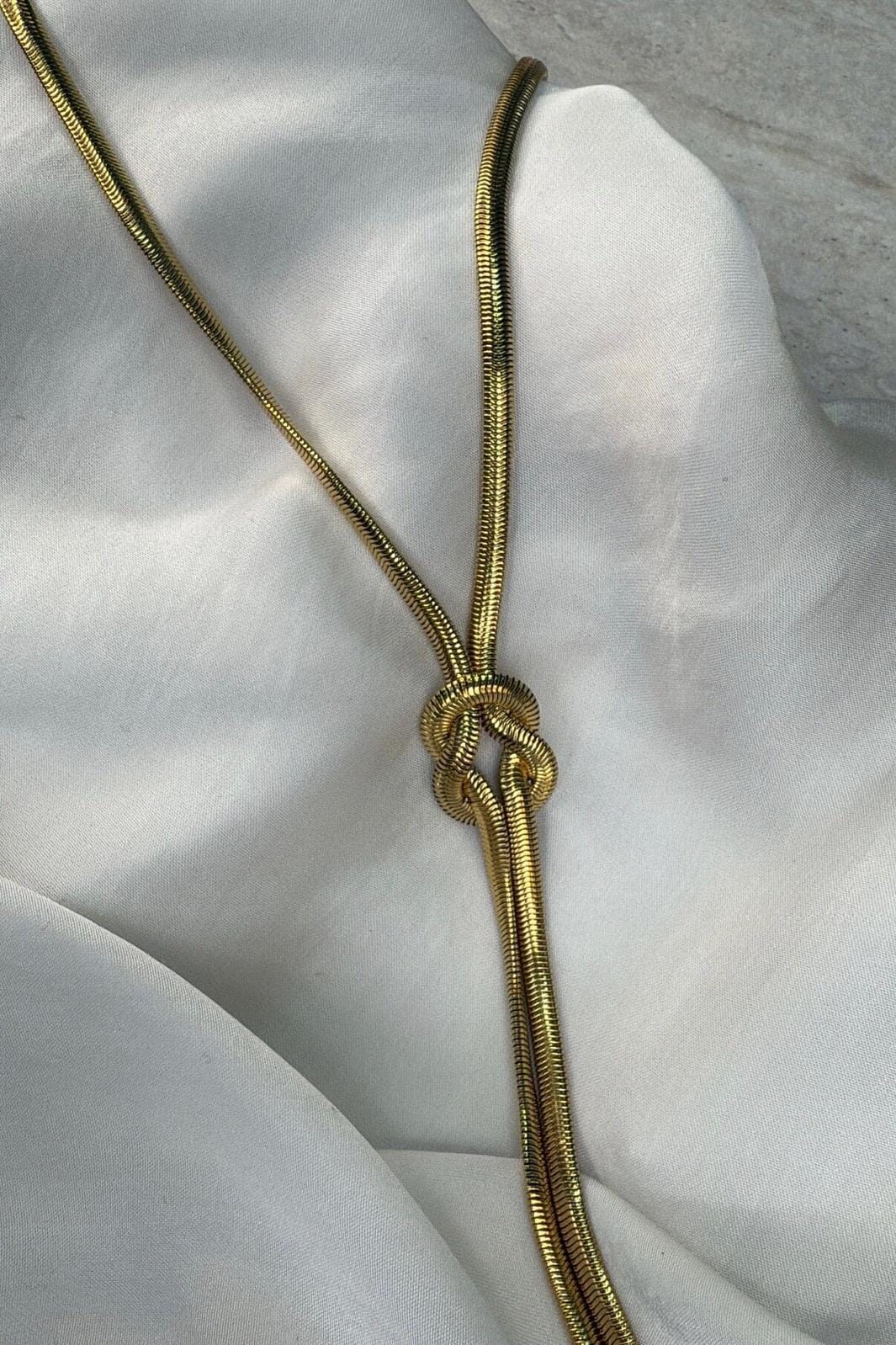Pozłacany naszyjnik Molly&My Jewellery z gładkim, wężowym splotem łańcuszka i węzłem pośrodku. Łańcuszek ma regulowane zapięcie.