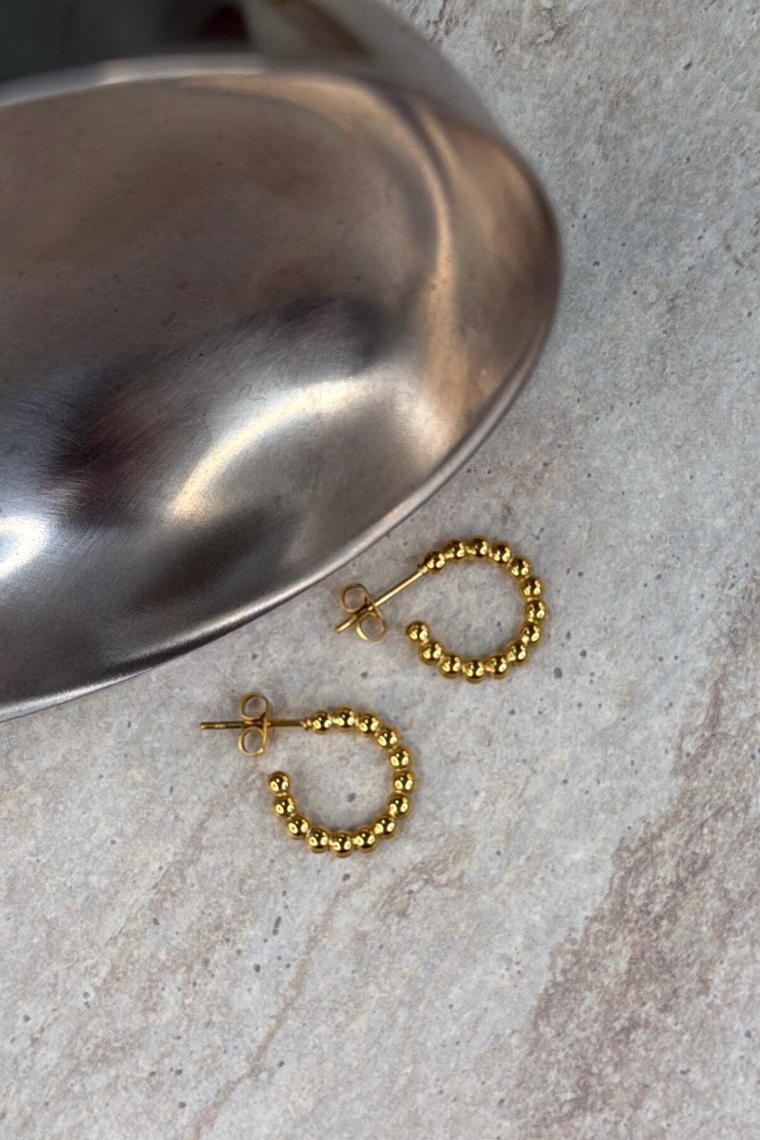 Pozłacane kolczyki od Molly&My Jewellery z półokrągłym kształtem kółka. Kolczyki są uformowane z małych kuleczek i mają złote wykończenie.