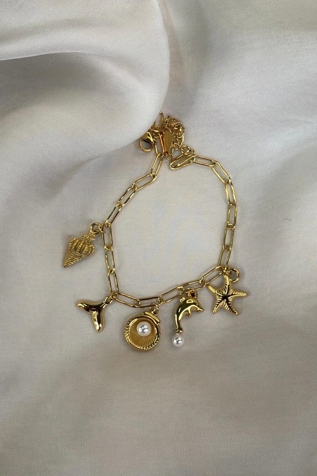 Pozłacana bransoletka od Molly&My Jewellery z zawieszkami w kształcie delfina, gwiazdy, muszli i ogona na łańcuszku z owalnymi ogniwami.