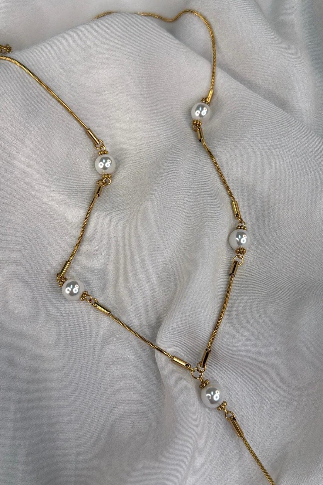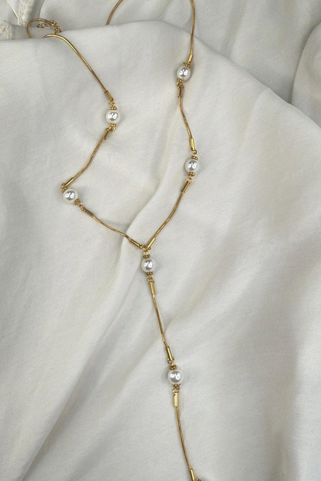 Złocony naszyjnik od Molly&My Jewellery z projektem w kształcie litery Y. Łańcuszek ma białe koraliki oraz małe cylindryczne elementy rozmieszczone wzdłuż łańcuszka.