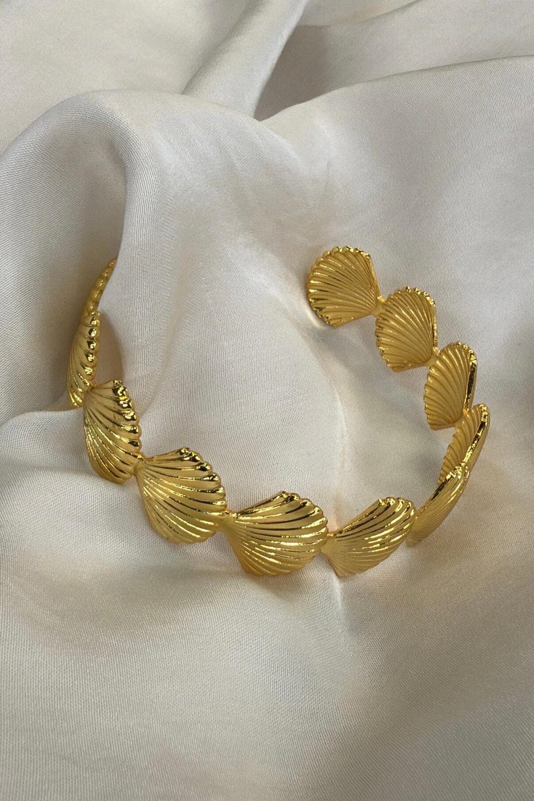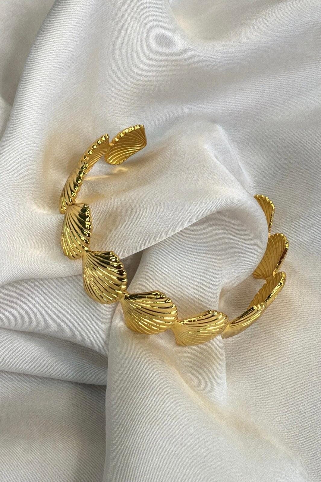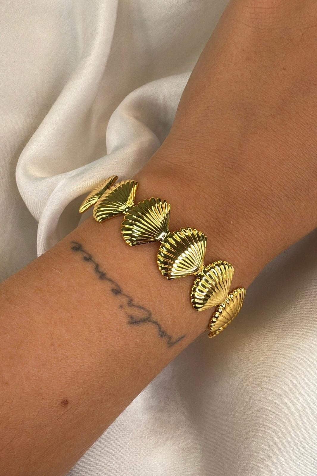 Pozłacana bransoletka od Molly&My Jewellery z ogniwami w kształcie muszli. Bransoletka wykonana jest z mosiądzu i ma lśniący, złoty kolor.