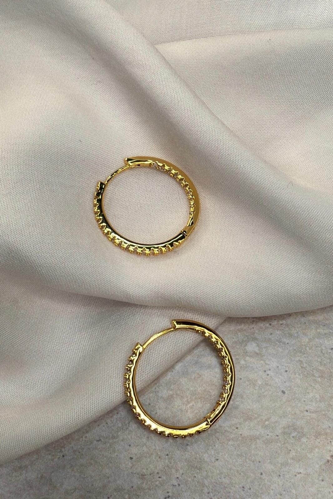Pozłacane kolczyki koła od Molly&My Jewellery. Kolczyki wykonane są z mosiądzu z małymi, przezroczystymi kamieniami CZ wzdłuż zewnętrznej krawędzi, w okrągłym kształcie.