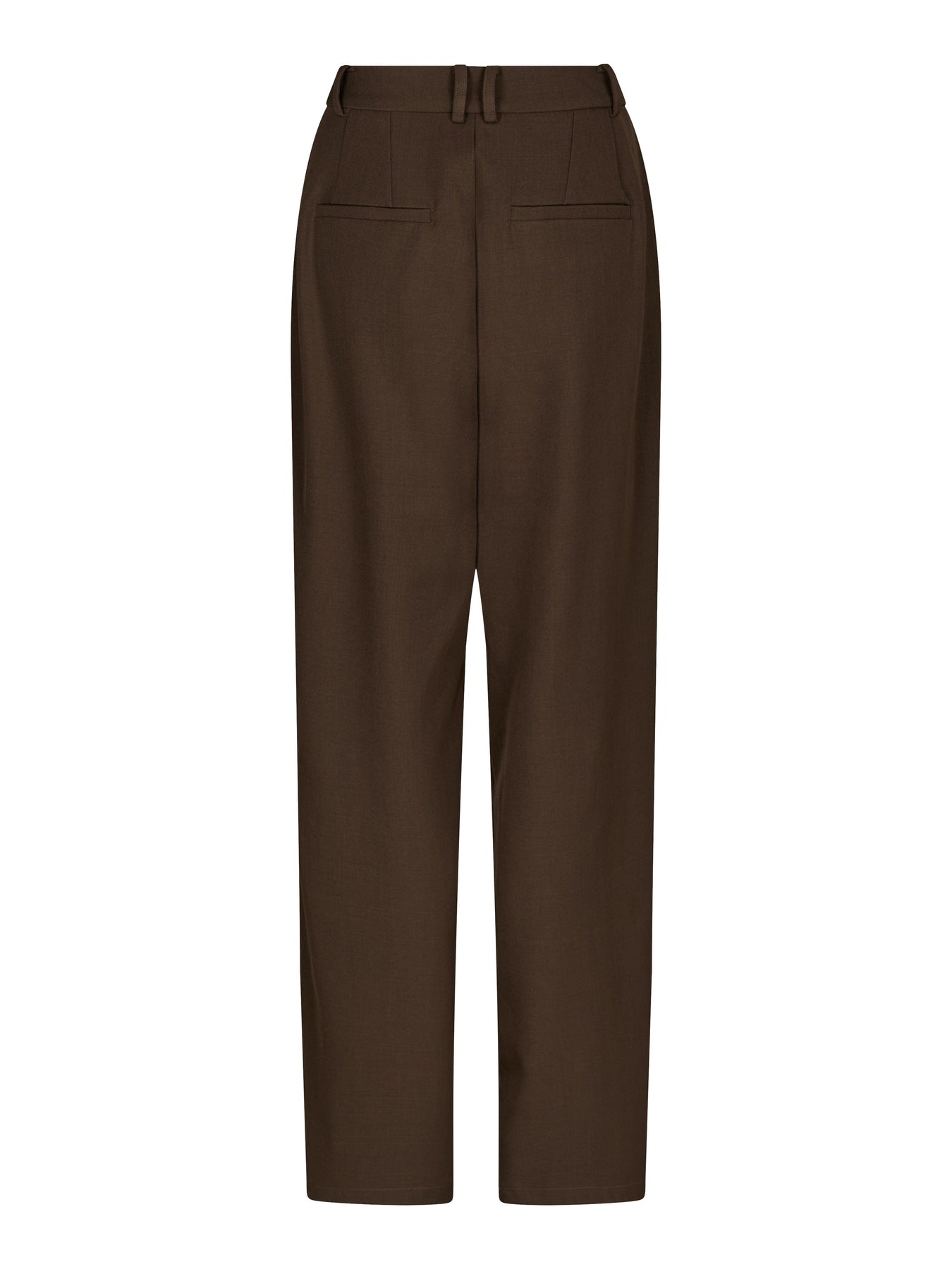 Ciemnobrązowe spodnie Molly&My x Julie Elgaard o luźnym kroju i długości sięgającej podłogi. Spodnie mają wysoki stan i są zapinane na zamek błyskawiczny oraz guziki.
