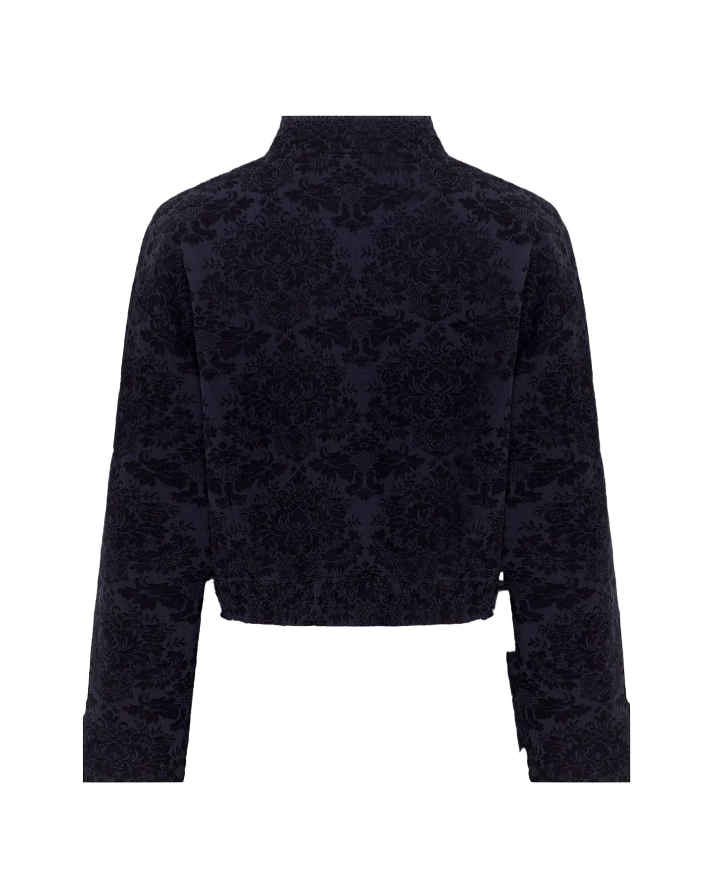 Kurtka od Moss Copenhagen w ciemnoniebieskim odcieniu z kwiatowym wzorem na całym materiale. Kurtka ma długie rękawy i stójkę.