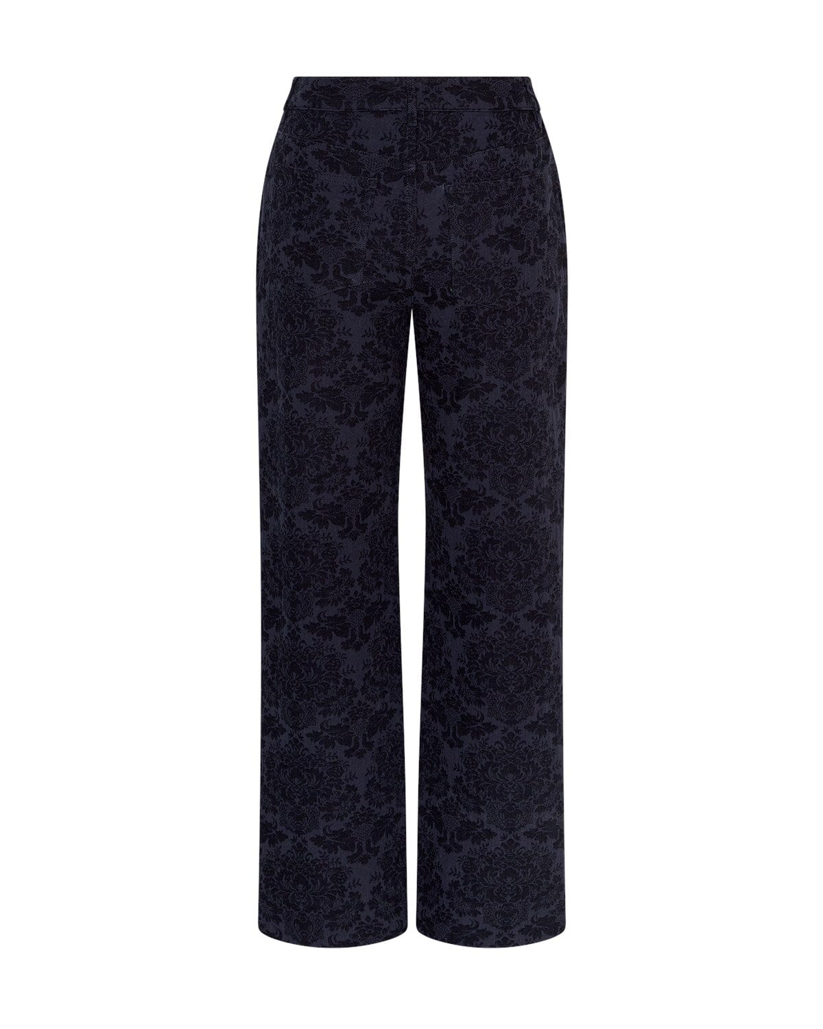 Spodnie Moss Copenhagen w ciemnoniebieskim kolorze z kwiatowym nadrukiem. Spodnie mają wysoki stan i szerokie nogawki o długości do kostek.