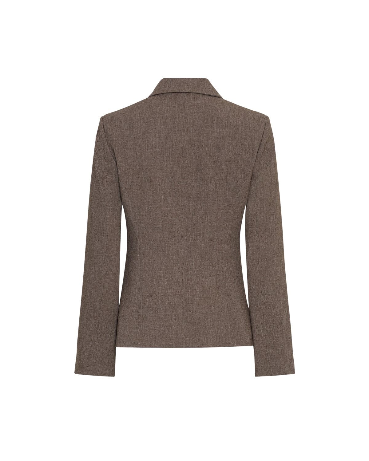 Marynarka od Moss Copenhagen w ciemnoszarym melanżowym odcieniu. Marynarka ma klasyczny kołnierz, długie rękawy oraz przednie kieszenie z klapą.