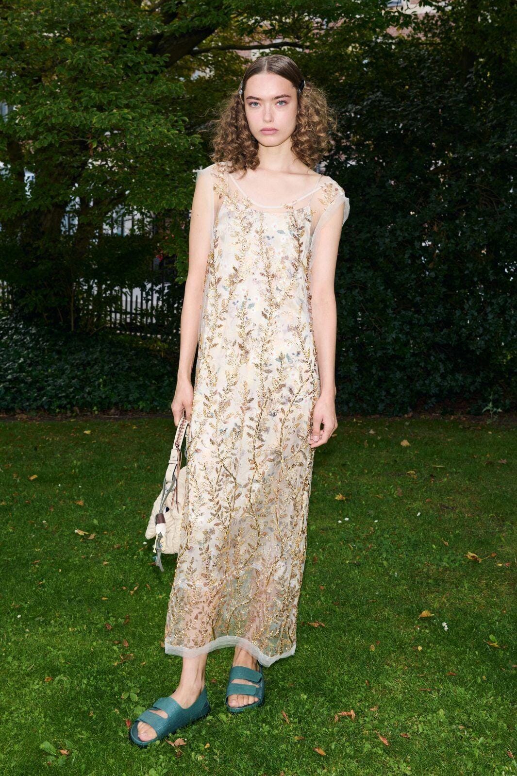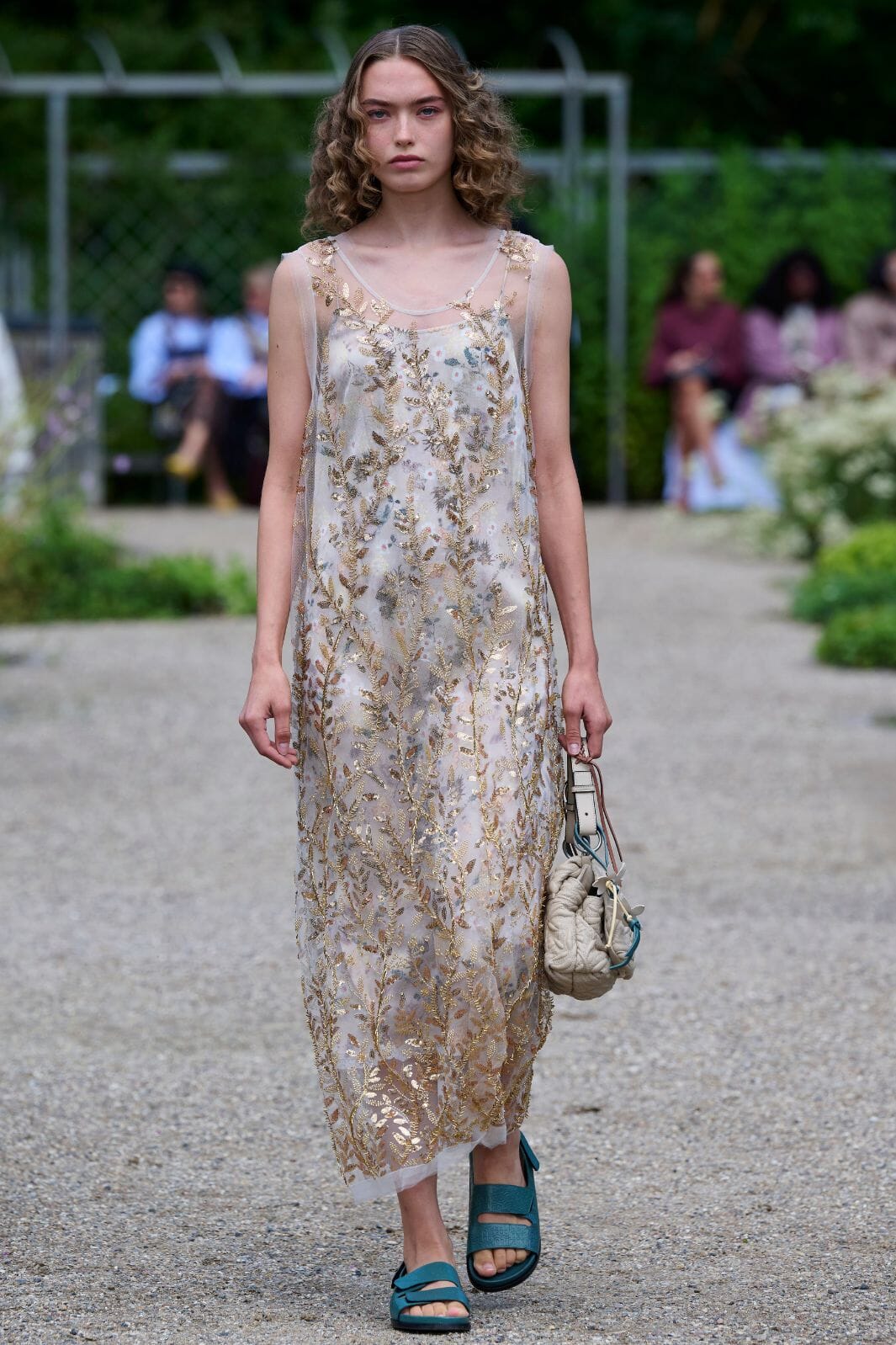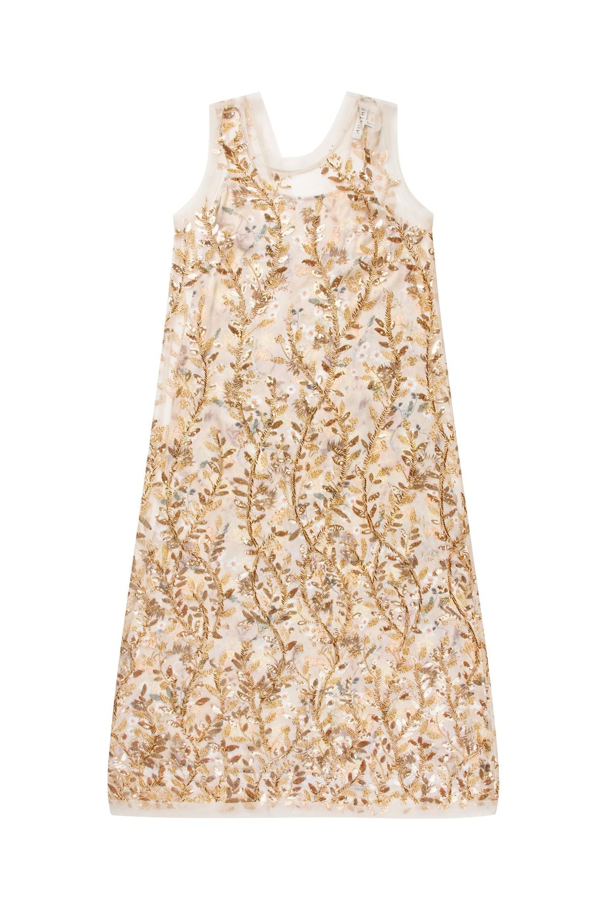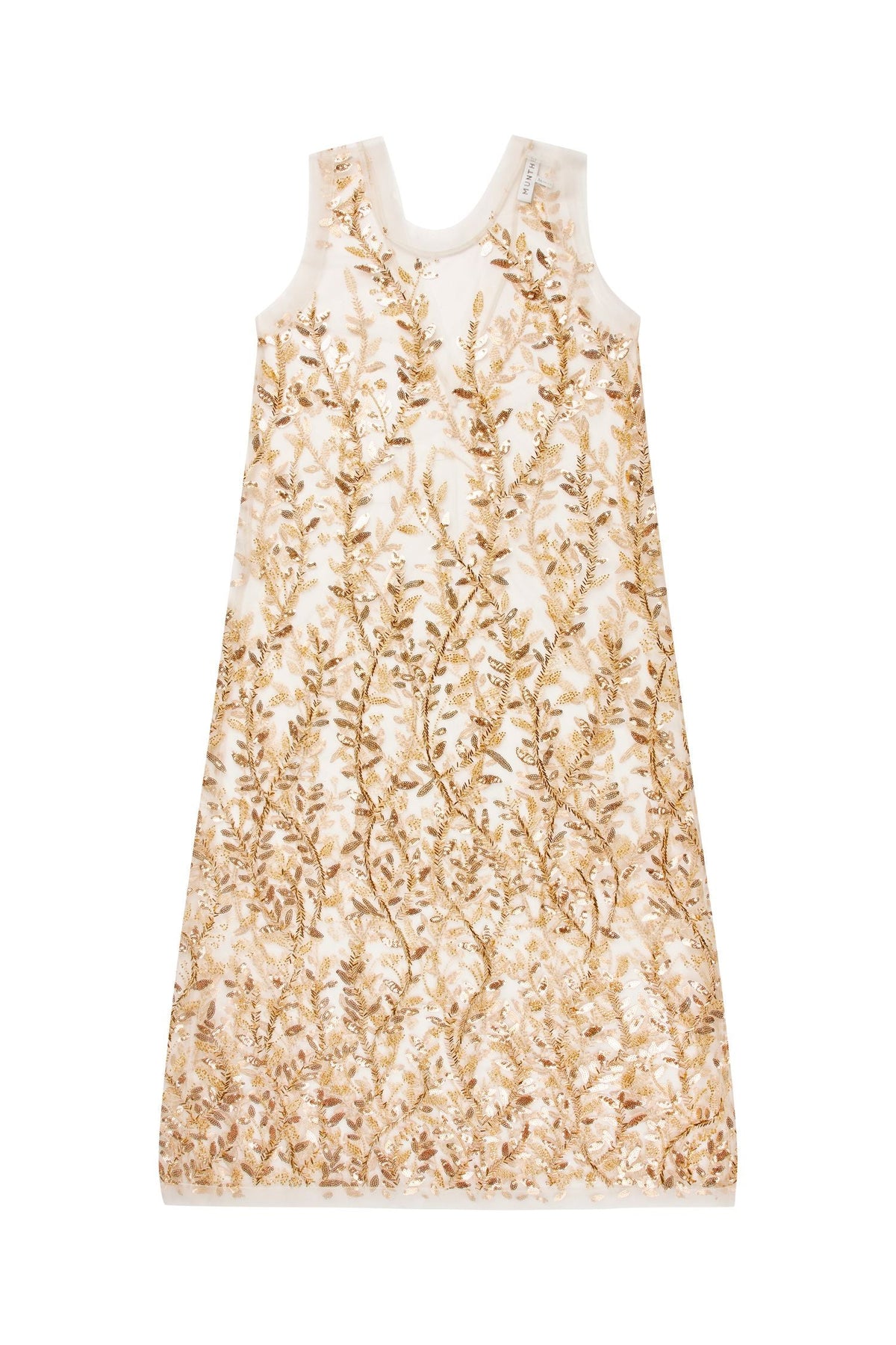 Sukienka marki Munthe w kolorze złotym z kwiatowym wzorem stworzonym z haftów, cekinów i perełkowych detali, ułożonych w liściasty motyw na półprzezroczystej tkaninie.