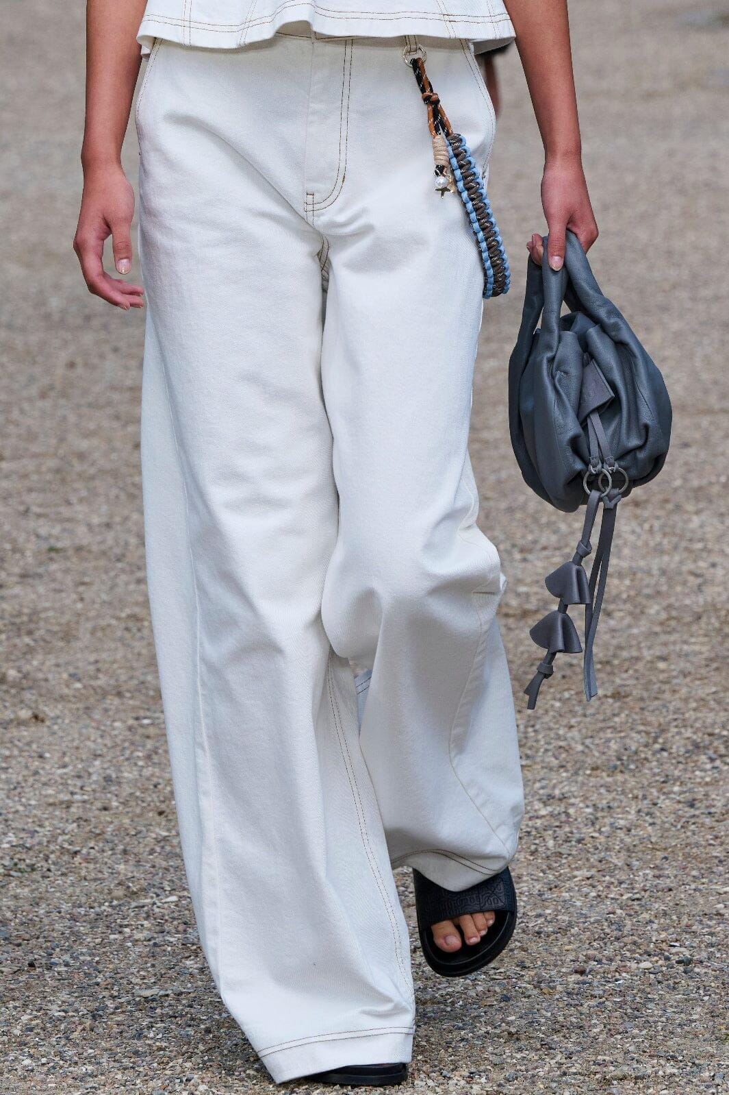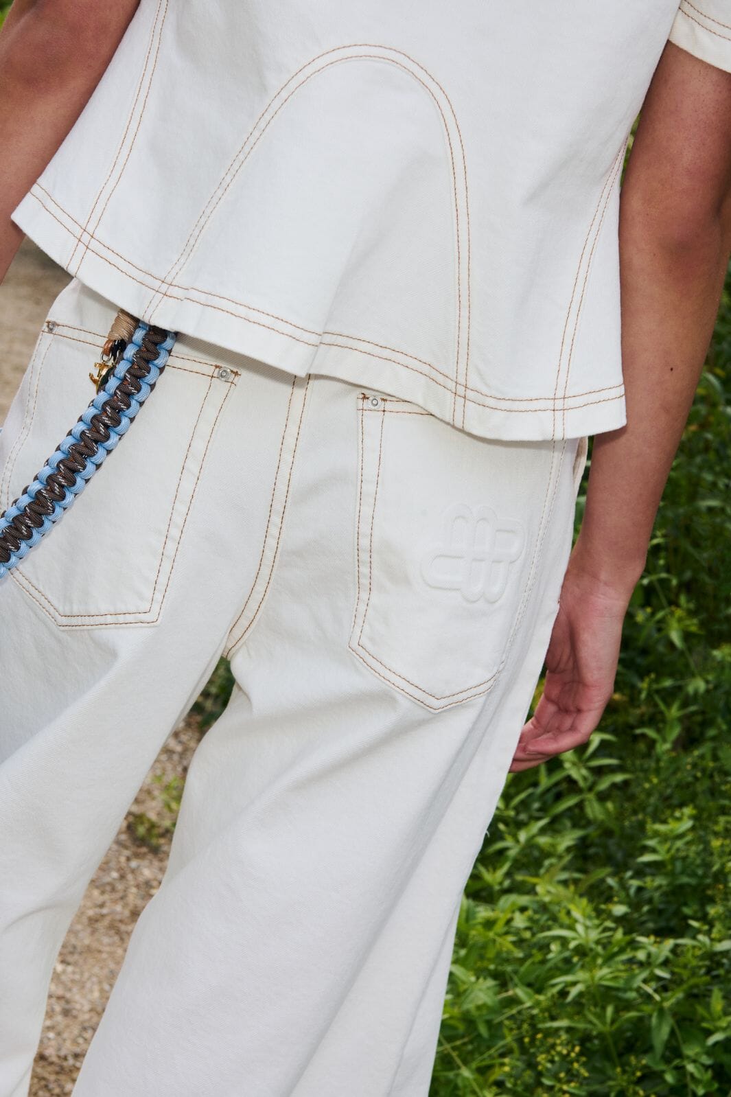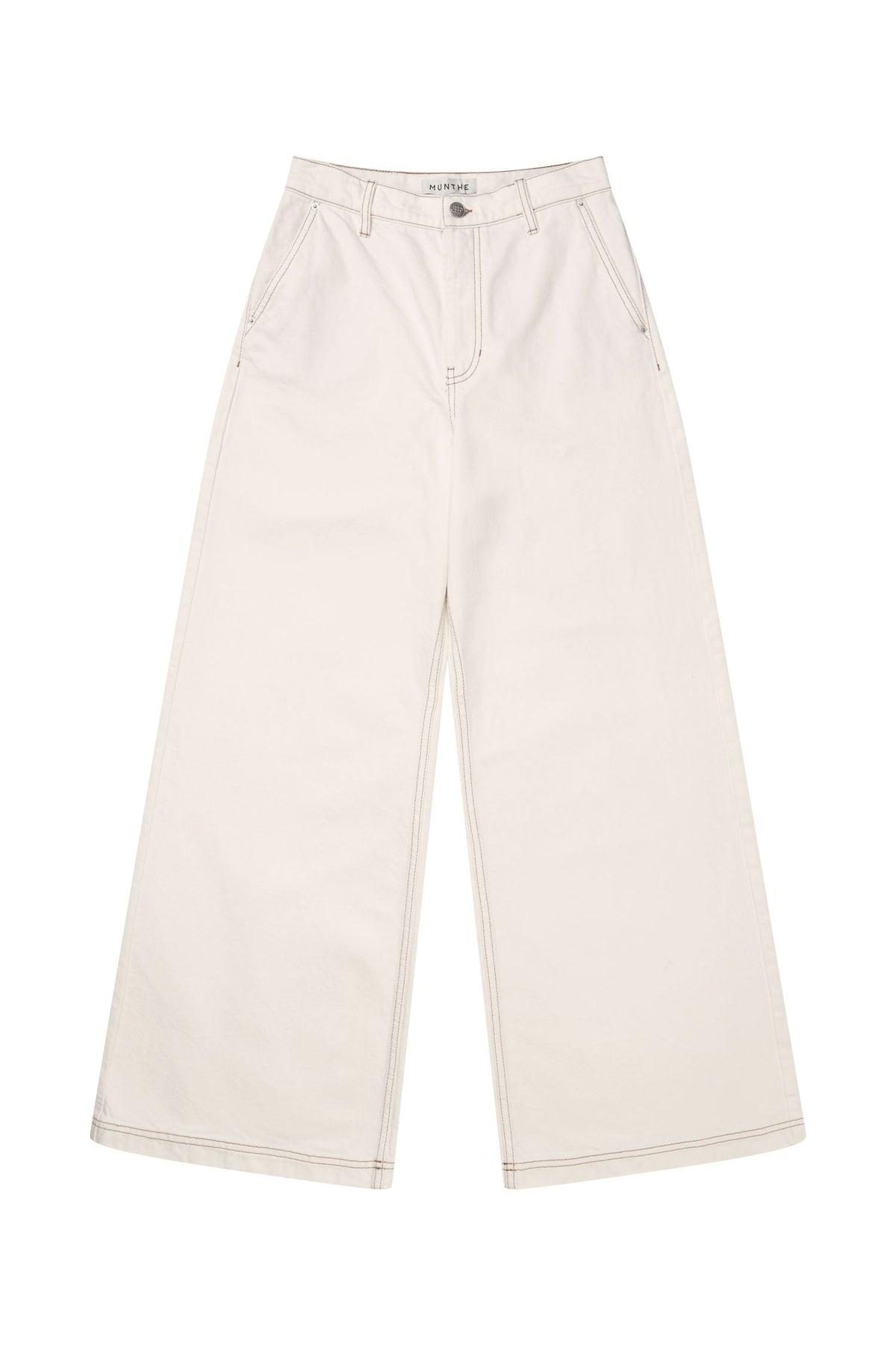Spodnie marki Munthe w jasnym, kości słoniowej kolorze. Wykonane w 99% z bawełny organicznej i w 1% z elastanu.