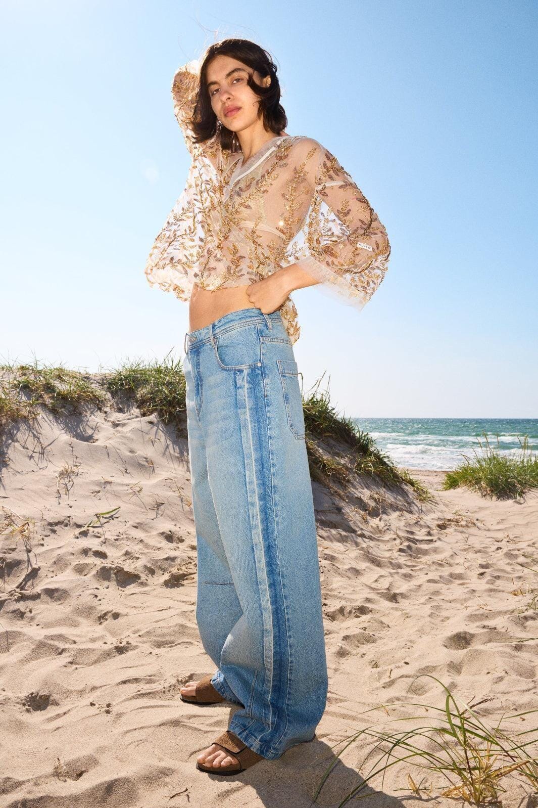 Niebieskie dżinsy marki Munthe z szerokim, swobodnym krojem. Spodnie mają wysoki stan, długość do ziemi oraz pasiaste panele po bokach z ciemniejszego denimu.