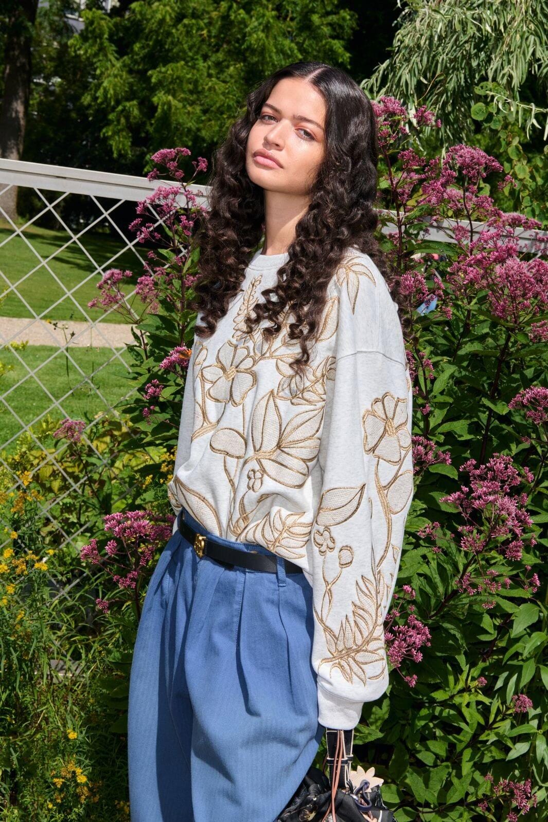 Jasnoszara bluza od Munthe z kwiatowym haftem w złotych odcieniach z przodu i na rękawach. Oversize’owy krój z okrągłym dekoltem i długimi rękawami.