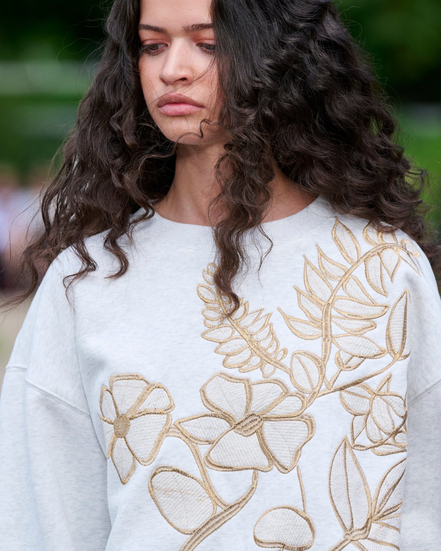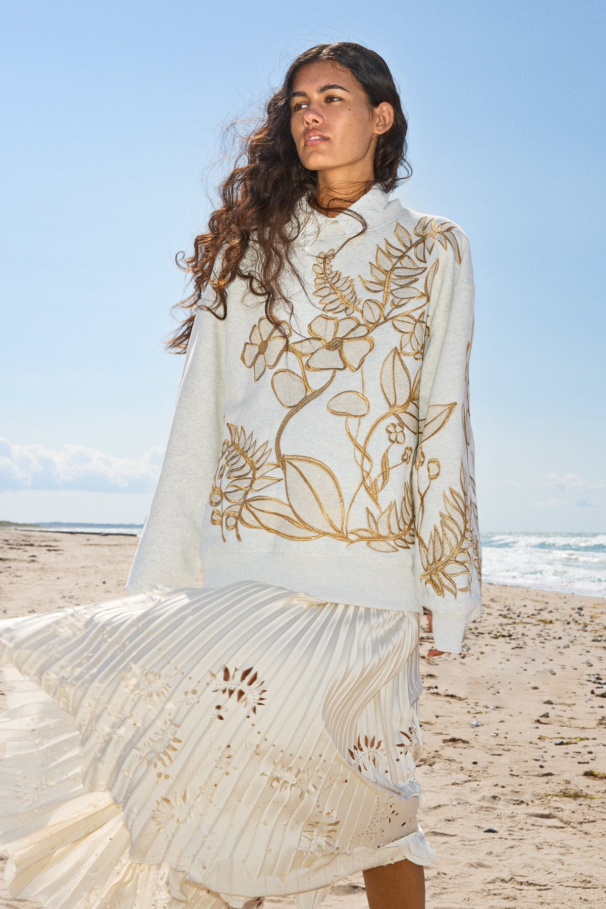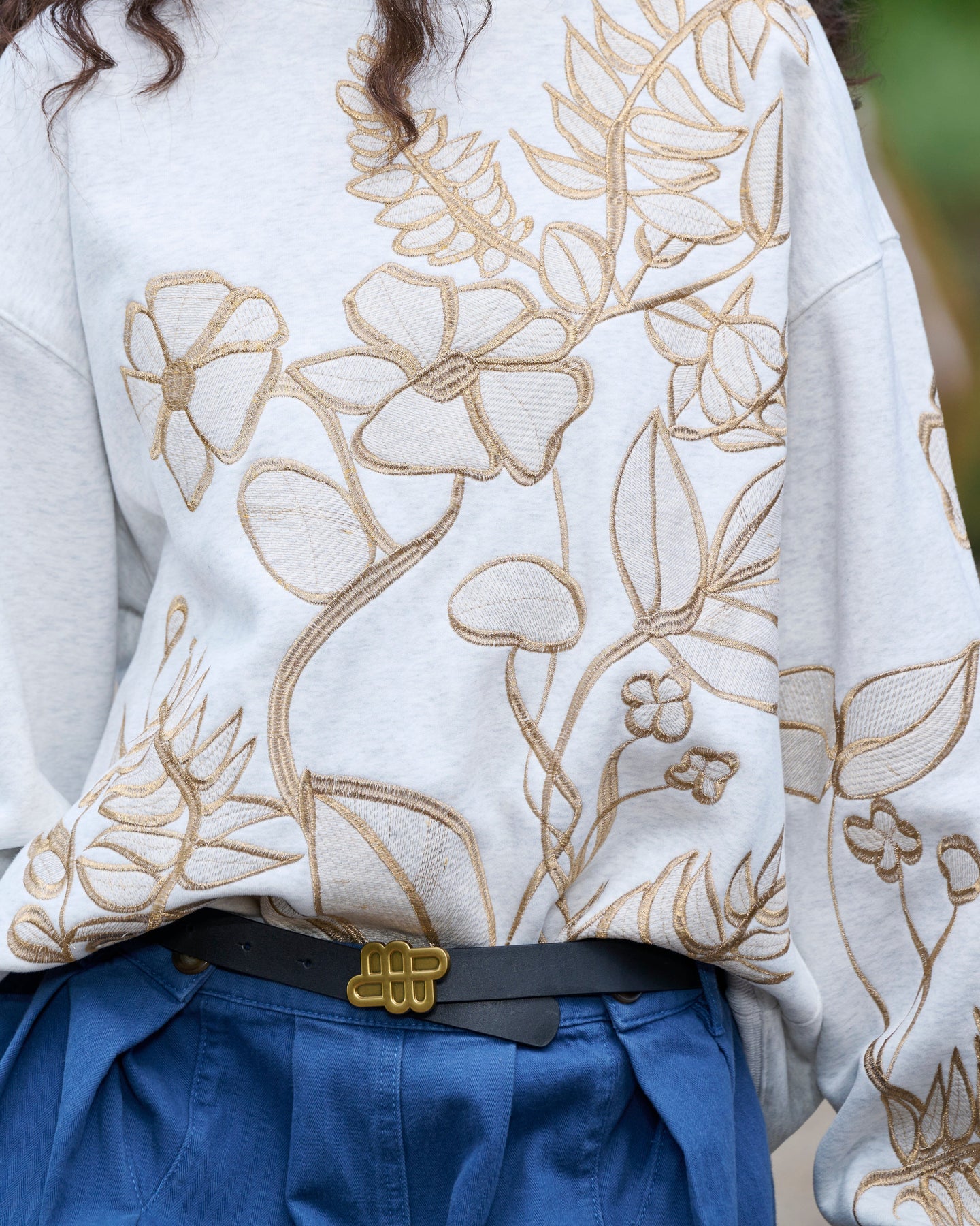 Jasnoszara bluza od Munthe z kwiatowym haftem w złotych odcieniach z przodu i na rękawach. Oversize’owy krój z okrągłym dekoltem i długimi rękawami.