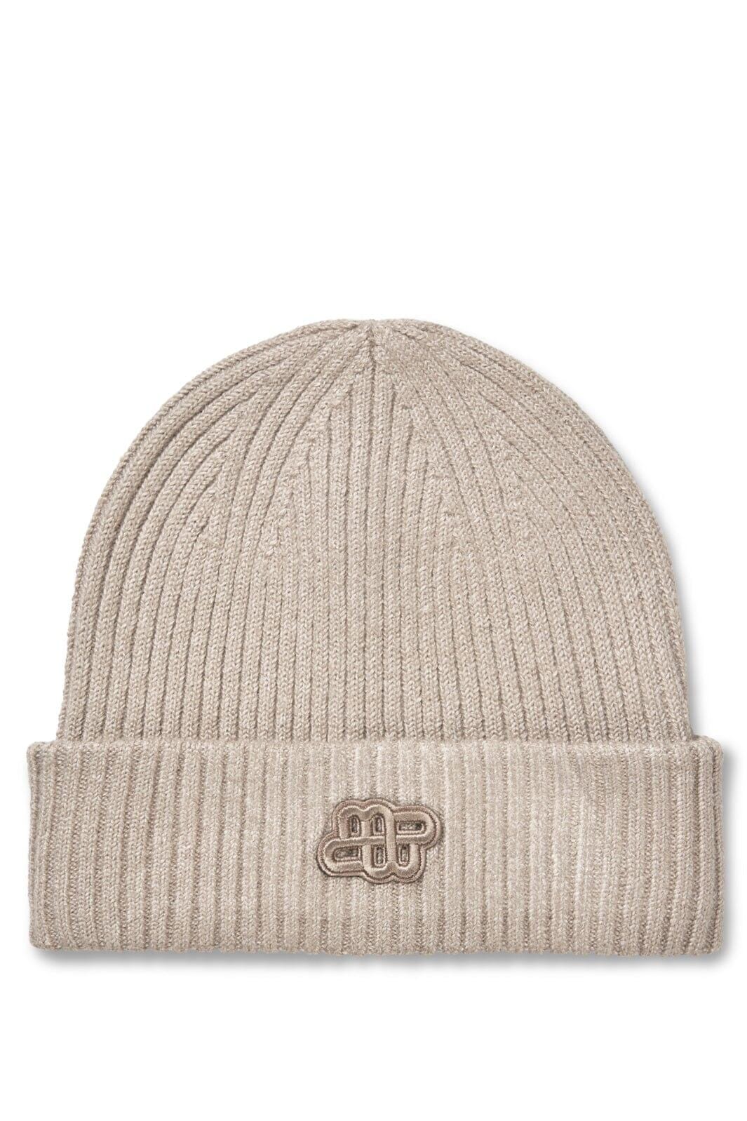 Beżowa czapka od Munthe z ribkowym wzorem. Czapka ma podwinięty brzeg i haftowane logo z przodu. Wykonana jest z miękkiej mieszanki przetworzonego poliestru.