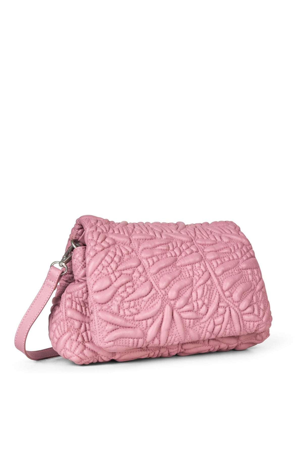 Różowa torebka na ramię marki Munthe, wykonana z miękkiej skóry jagnięcej z pikowanym kwiatowym wzorem. Torebka ma magnetyczne zapięcie i regulowany pasek na ramię.