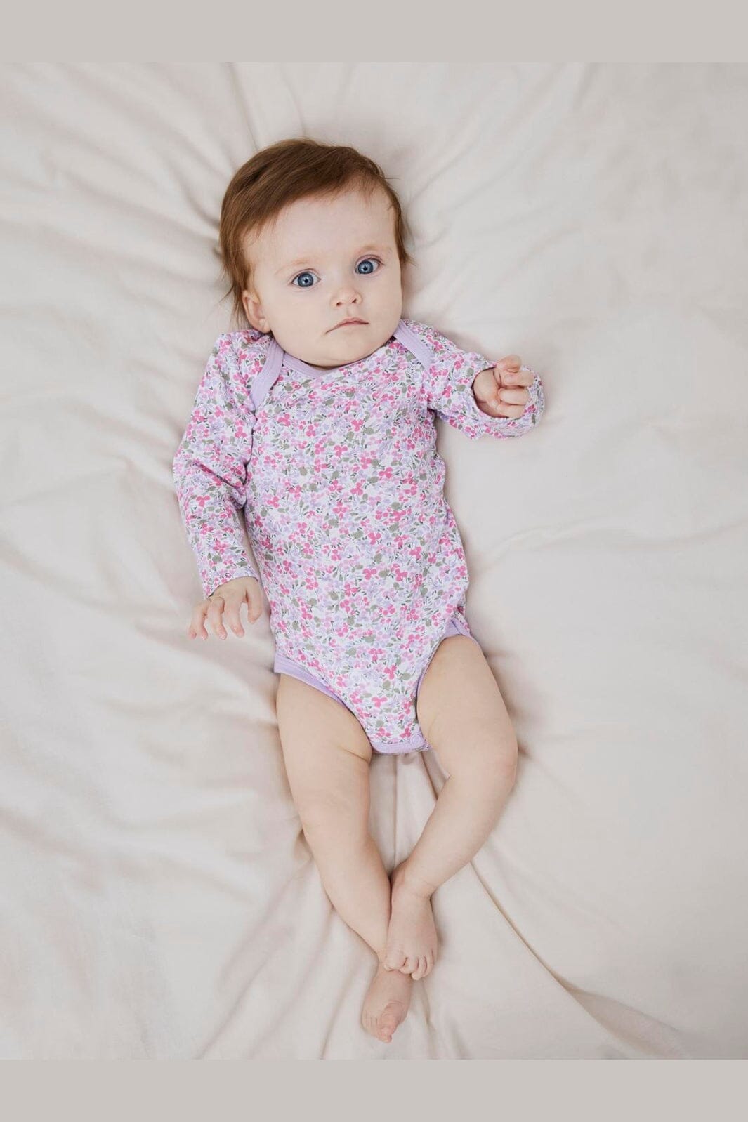 Body od Name It w jasnofioletowym kolorze z drobnym kwiatowym nadrukiem. Wykonane z mieszanki bawełny organicznej i zwykłej.