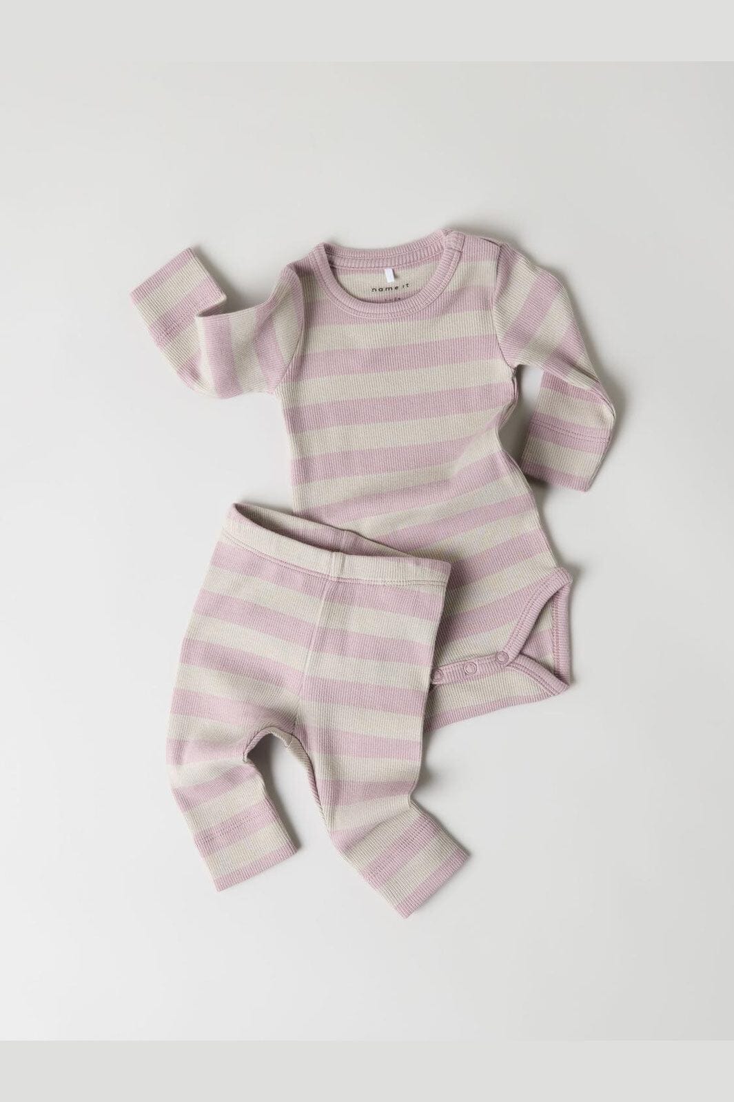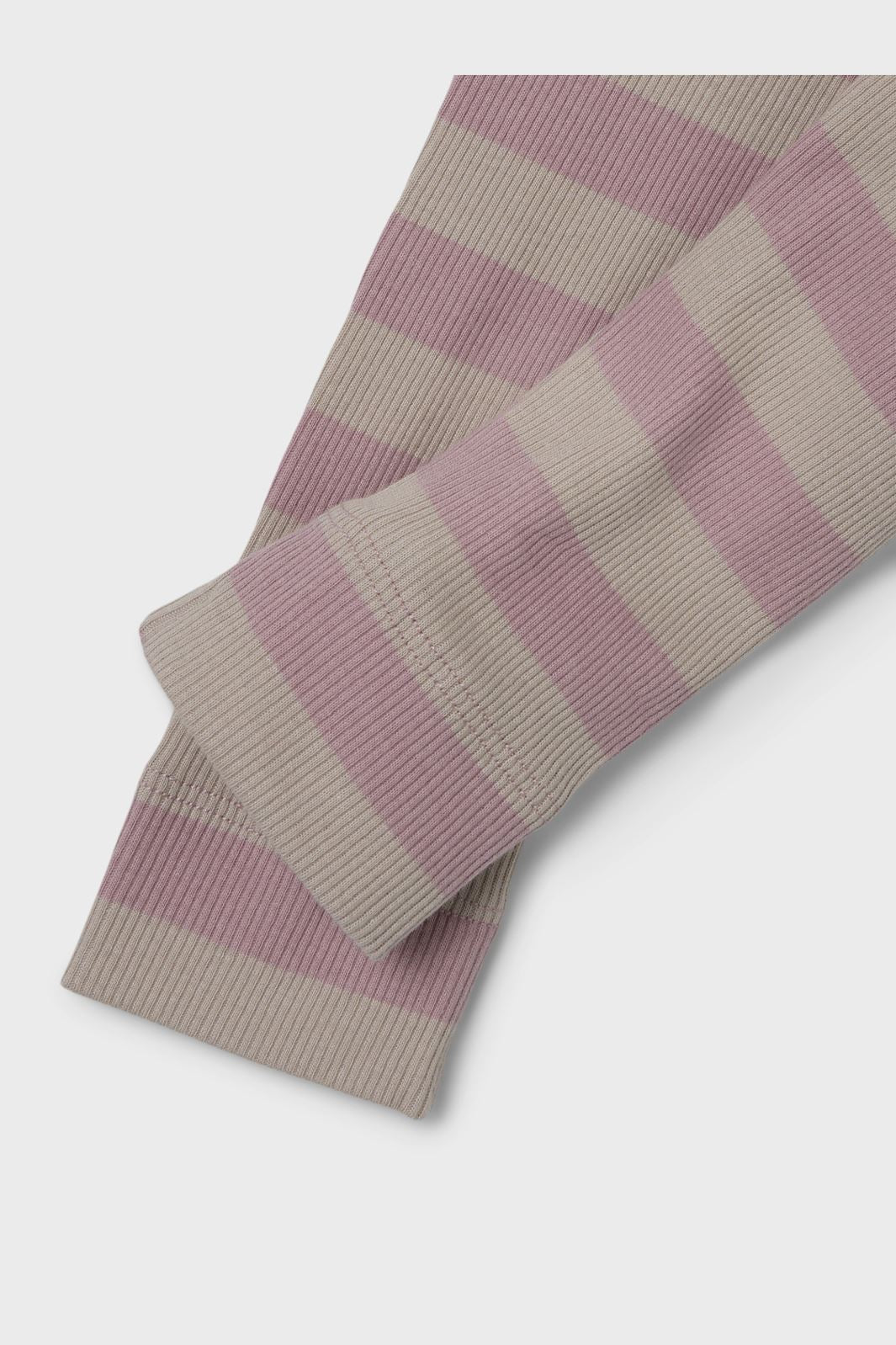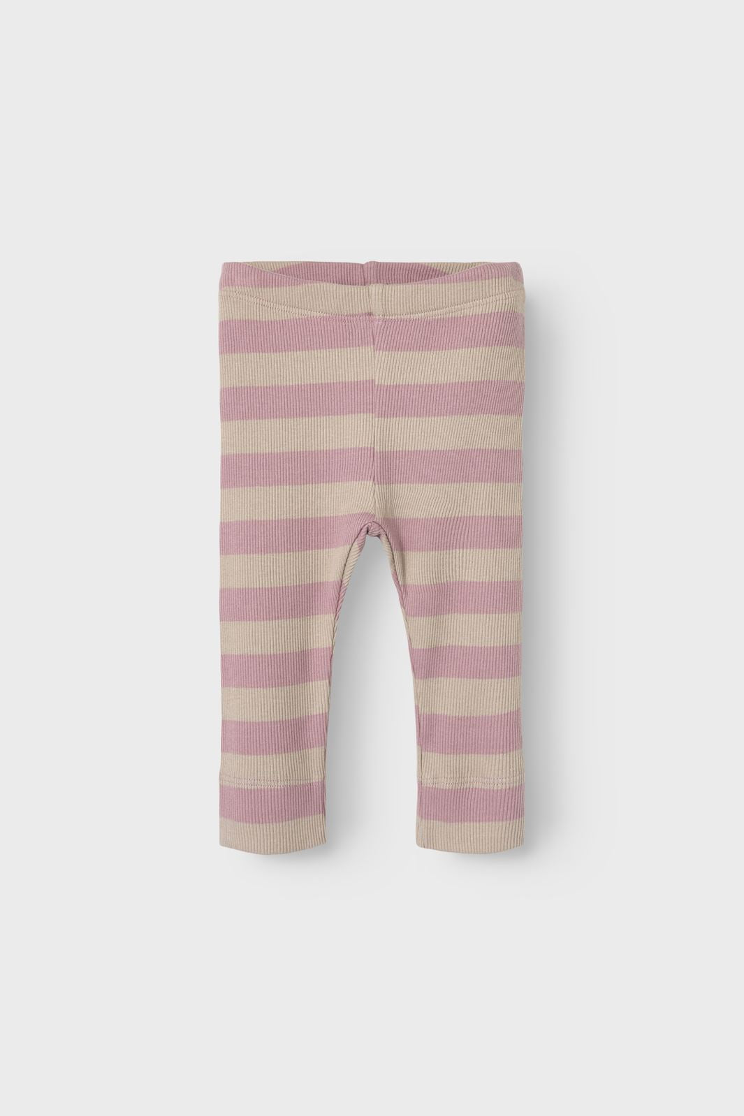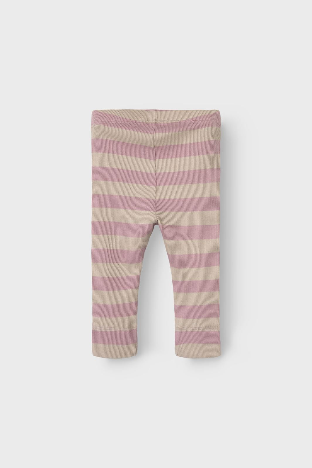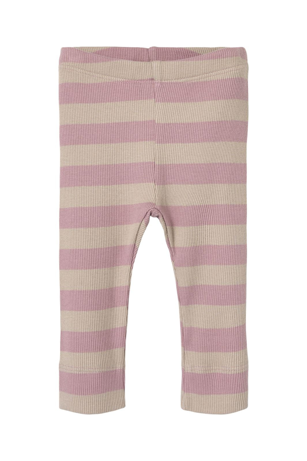 Legginsy ribbed od Name It z paskami w beżowym i jasnoróżowym kolorze. Dopasowany krój ma elastyczny pas i sięga do kostek.