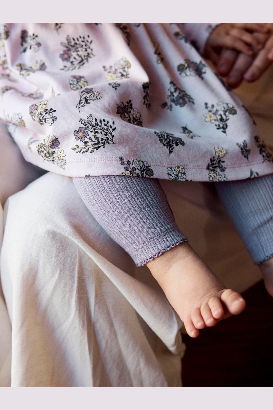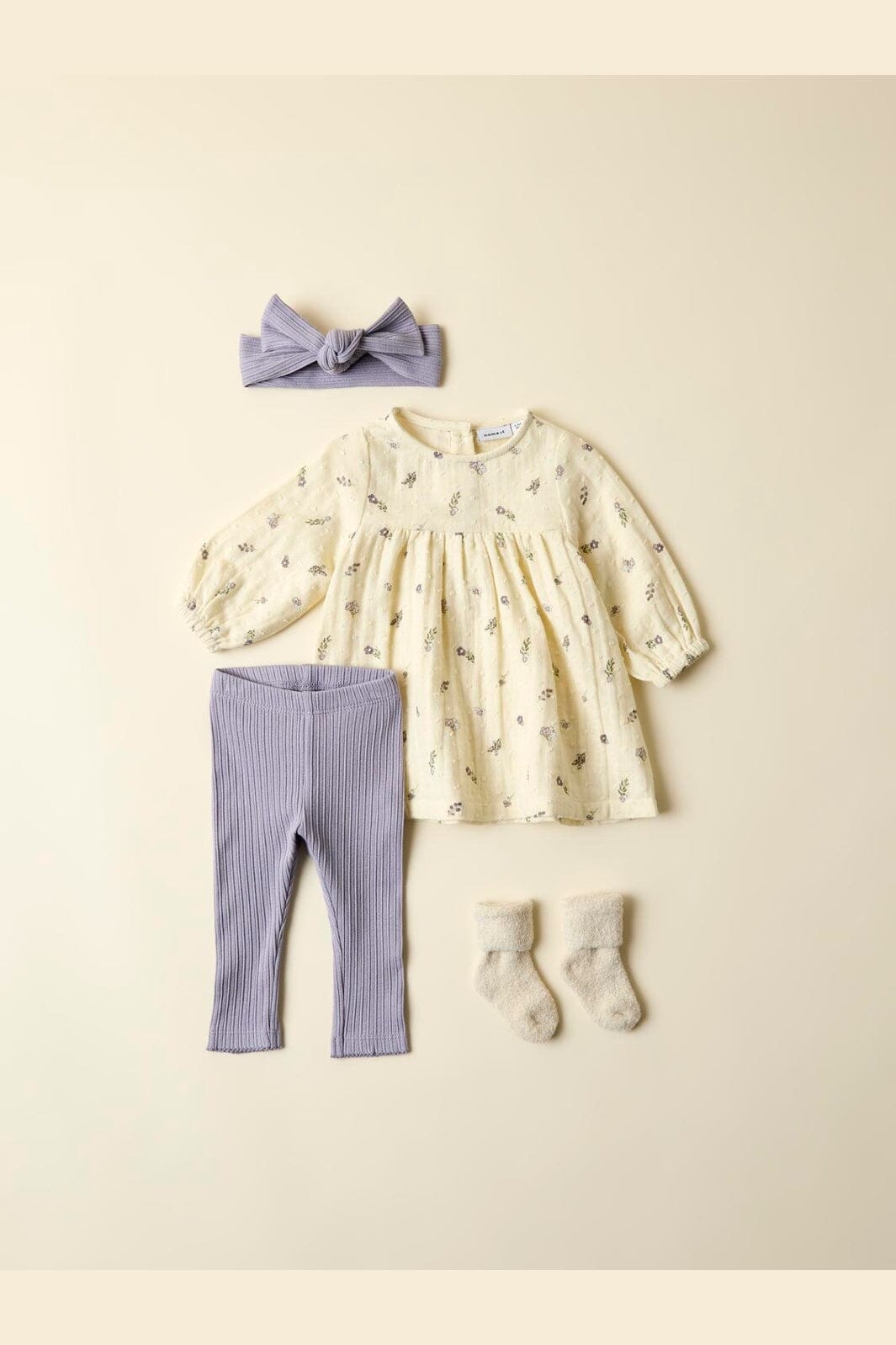Legginsy Name It w jasnym lawendowoszarym odcieniu. Wykonane z miękkiej, organicznej bawełny z dodatkiem elastanu dla większej elastyczności.