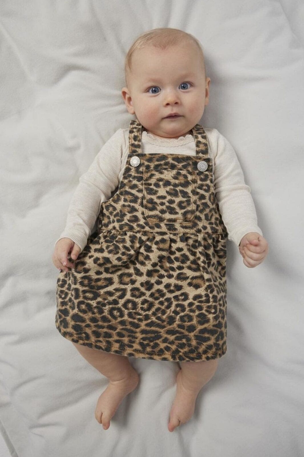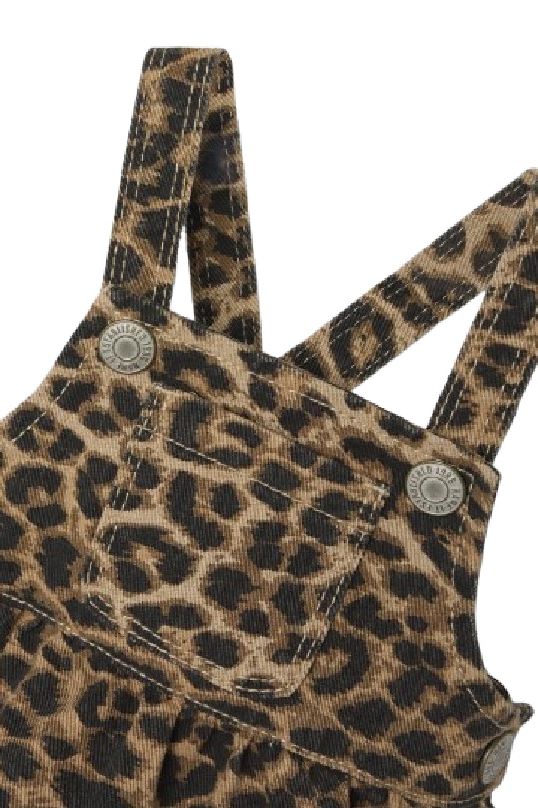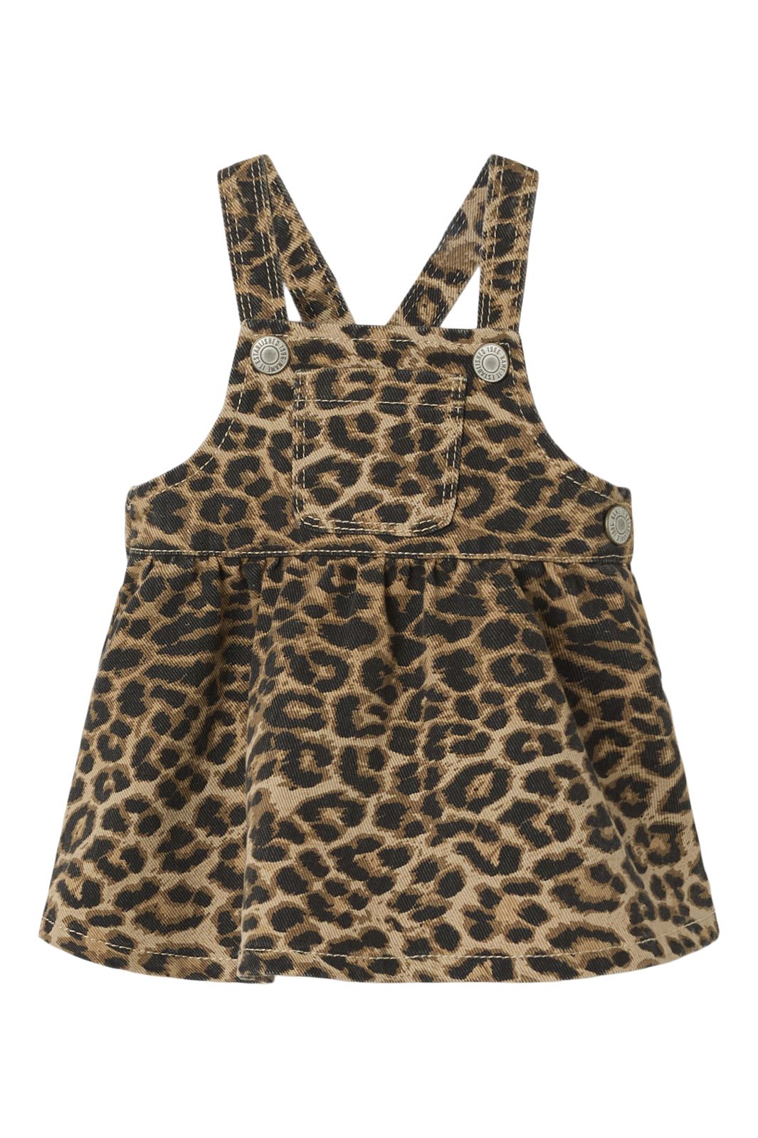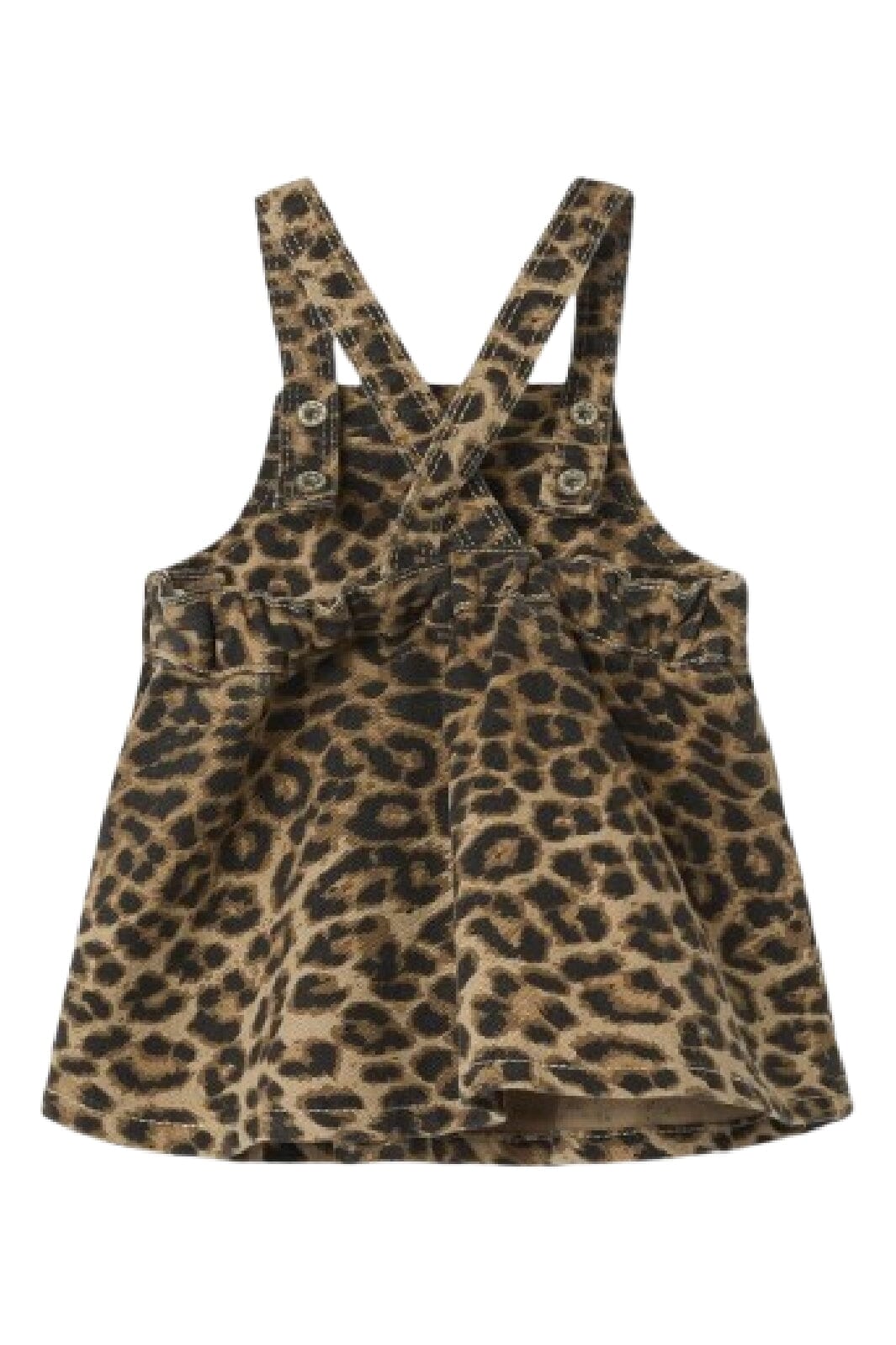 Stylowa spódnica od Name It z tkaniny twill w wzór lamparta. Spódnica ma szelki i kieszonkę na piersi oraz regulowaną talię z zakładkami i guzikami.