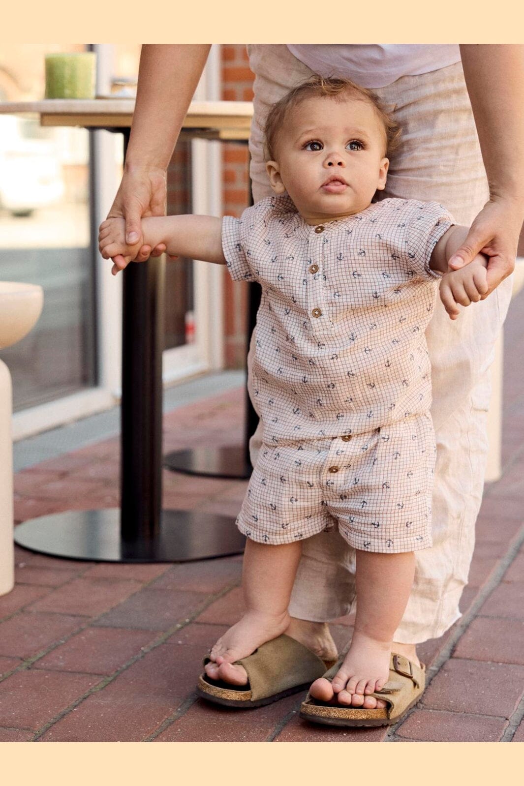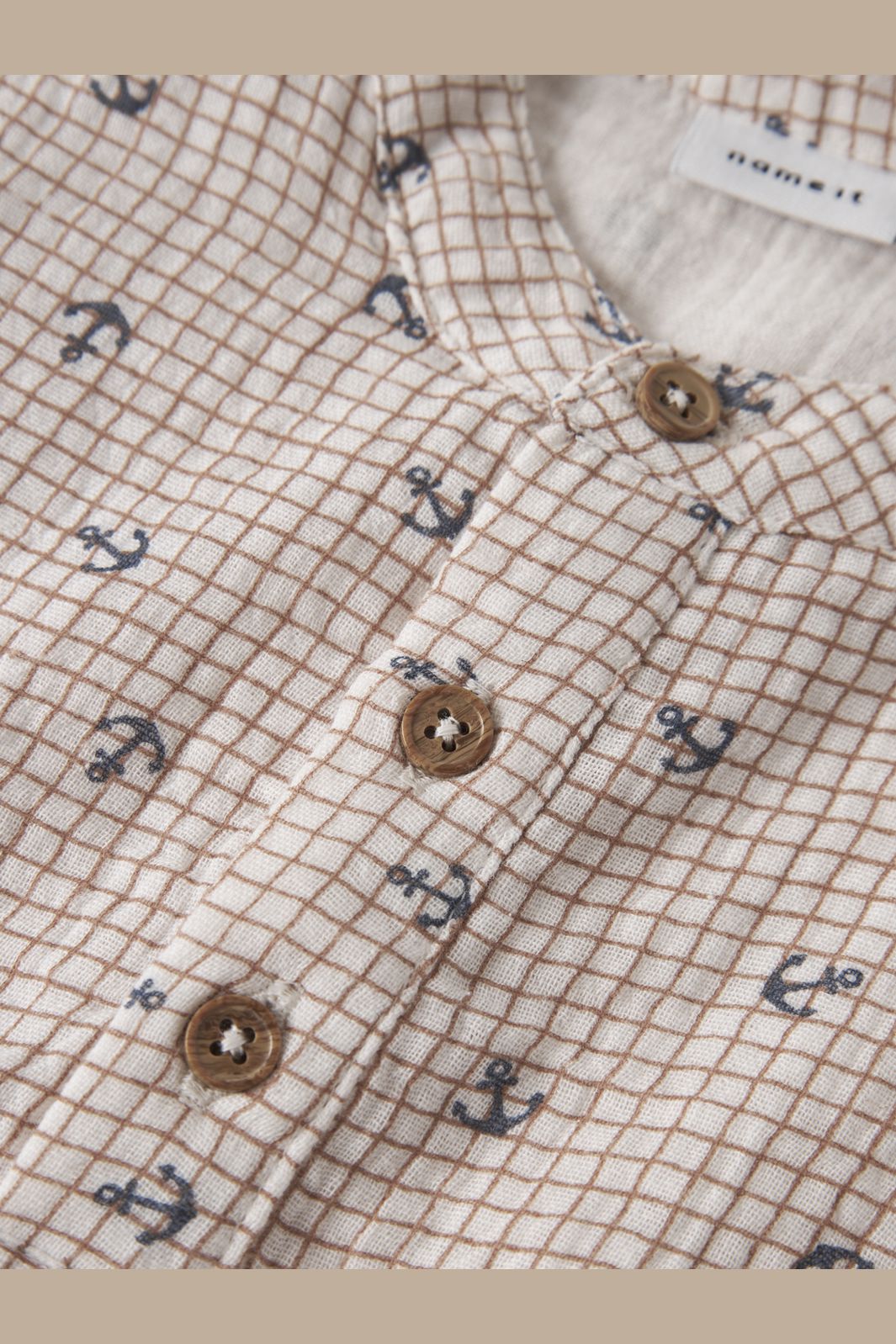 Koszula z krótkim rękawem marki Name It w odcieniach kremowym i białym. Koszula ma kratkowany wzór z małymi nadrukami kotwic.