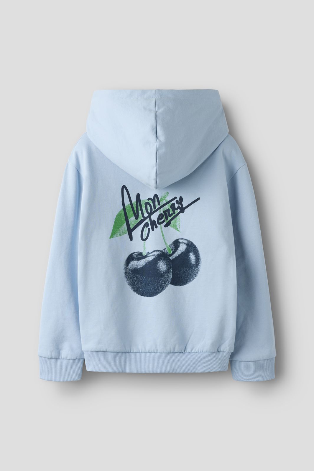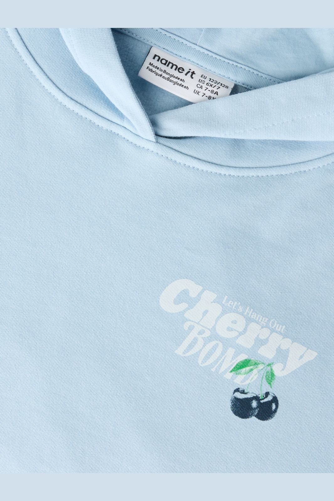 Jasnoniebieska bluza z kapturem marki Name It z motywem wiśni i napisem z przodu oraz z tyłu. Bluza ma kaptur i długie rękawy.