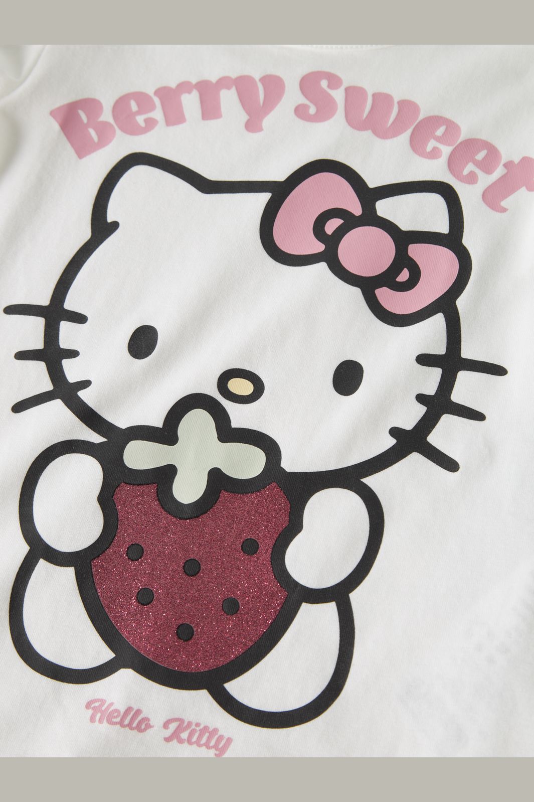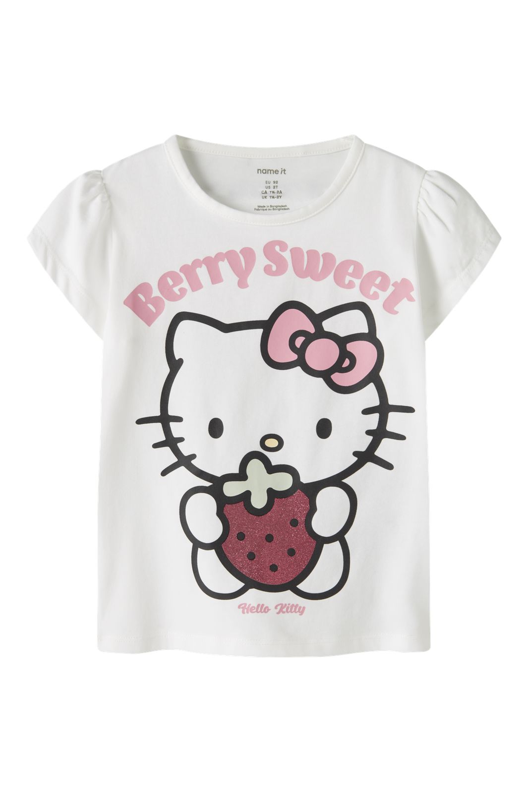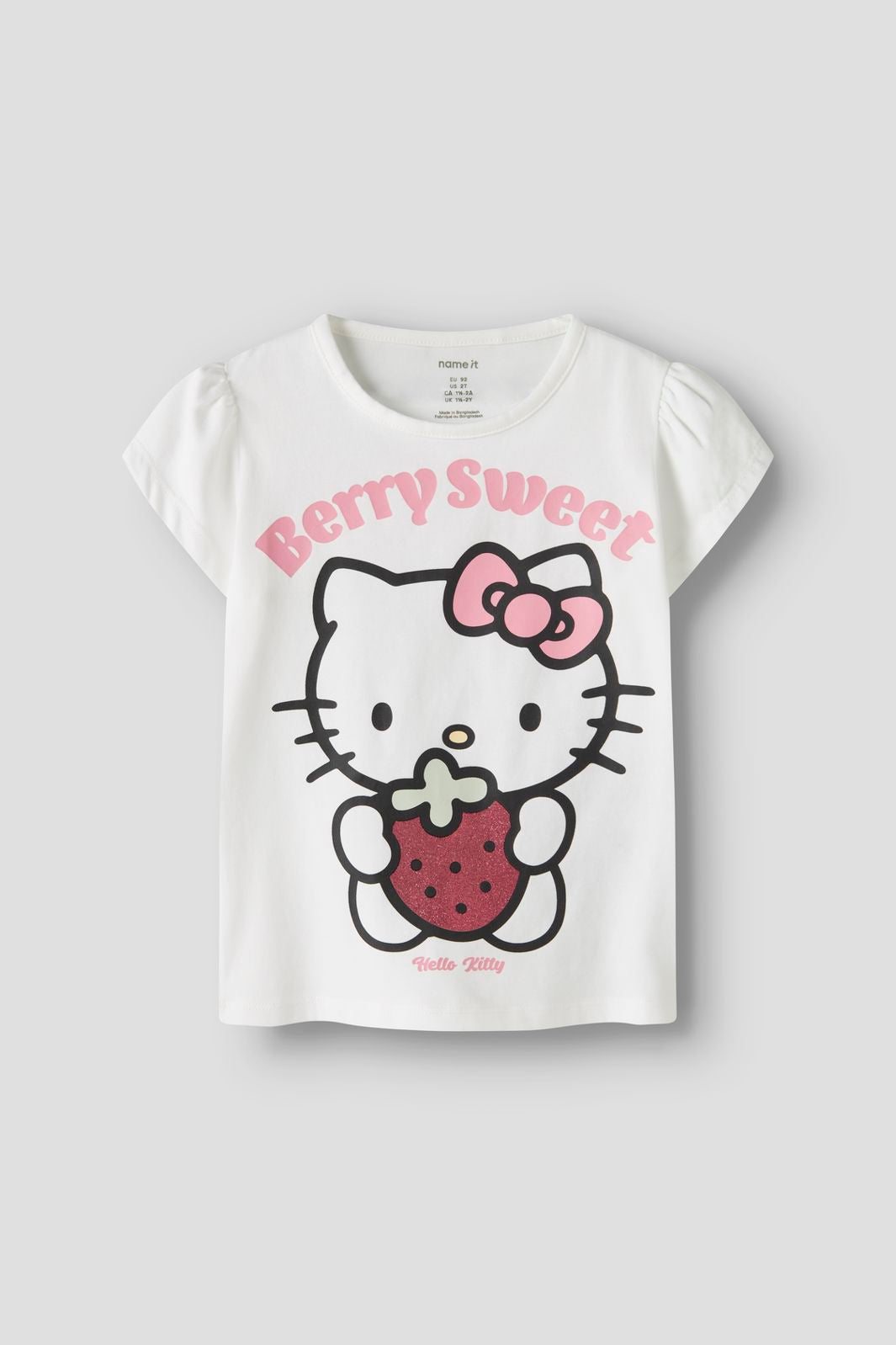 Biała koszulka T-shirt od Name It z nadrukiem Hello Kitty trzymającej truskawkę. Napis Berry Sweet znajduje się nad motywem, a T-shirt ma krótkie bufiaste rękawy.