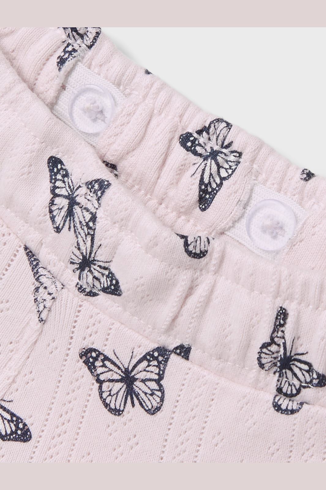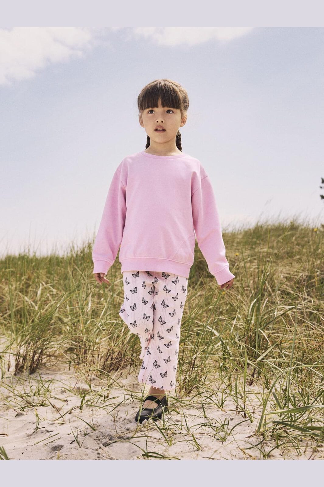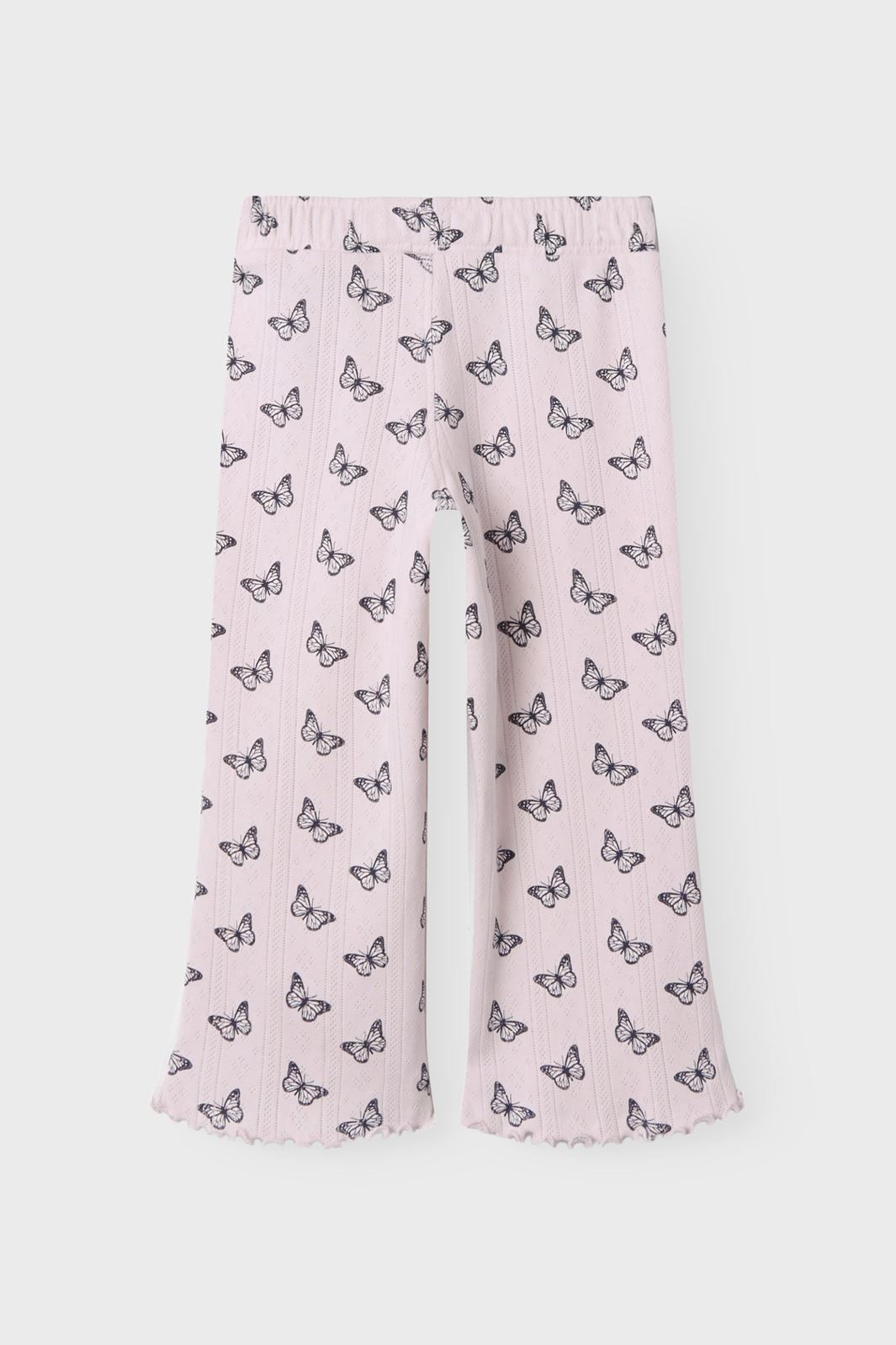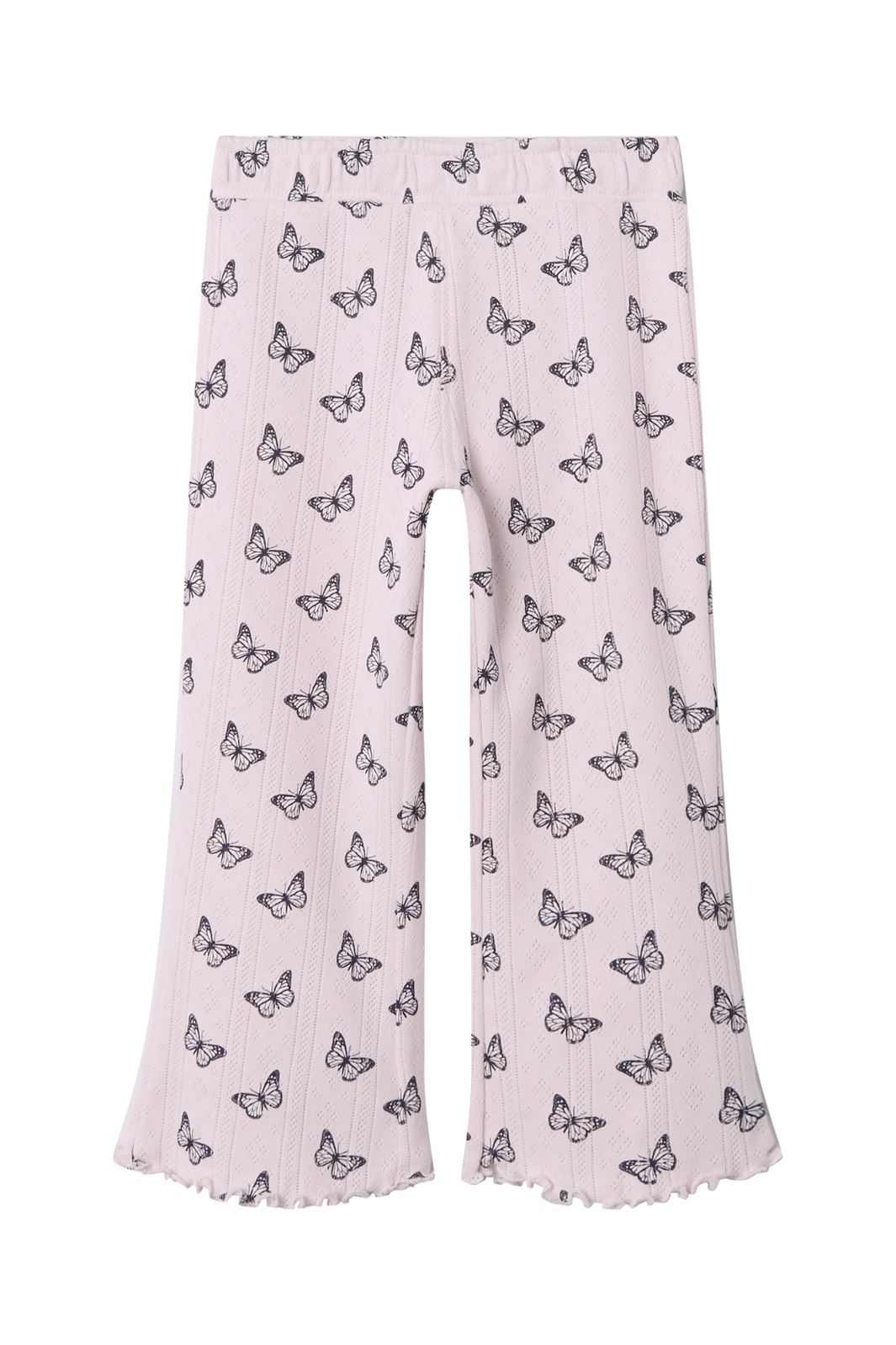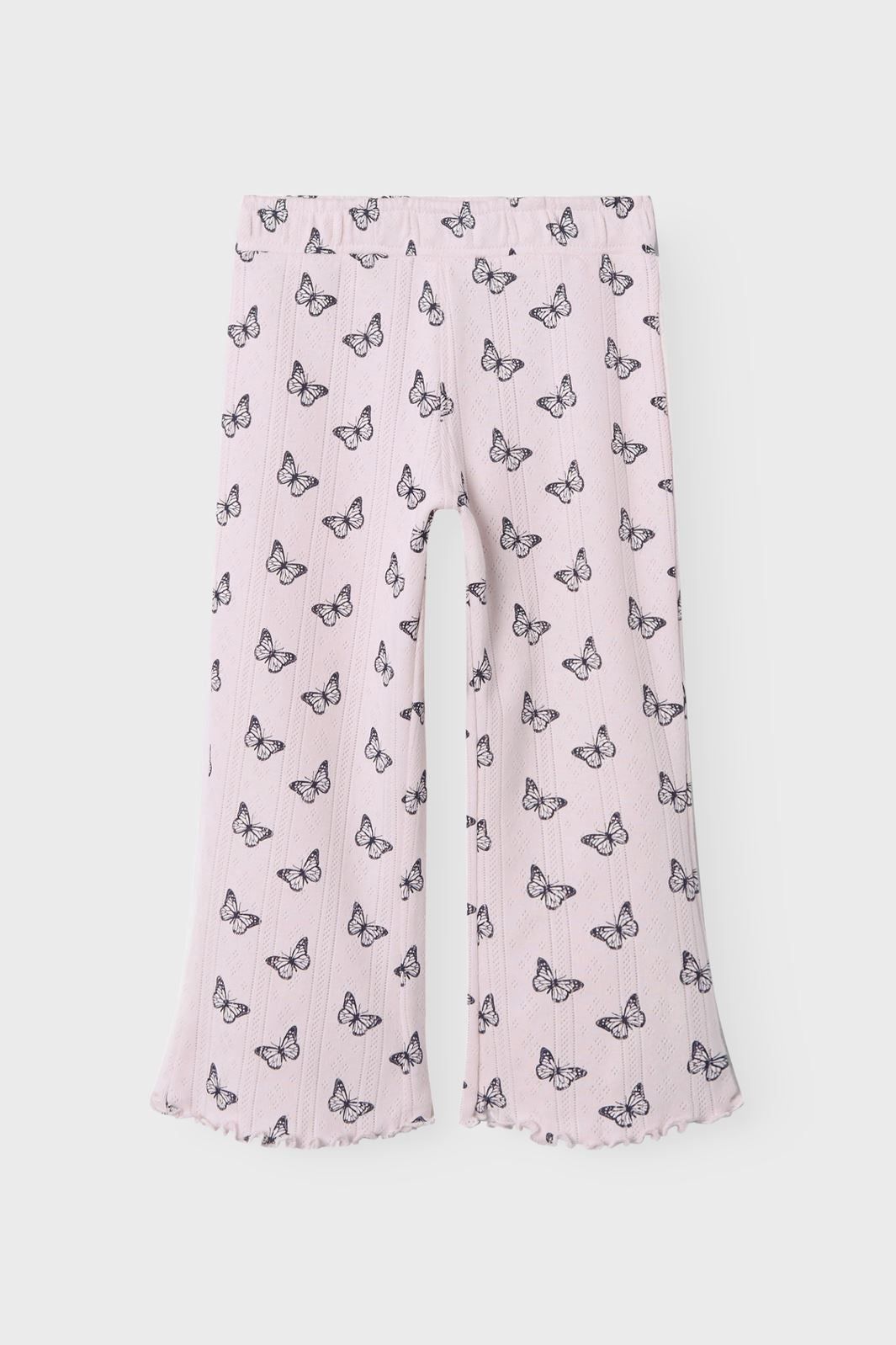 Różowe spodnie od Name It o szerokim kroju i wzorze motyli. Spodnie mają elastyczny pas i sięgają do połowy łydki.