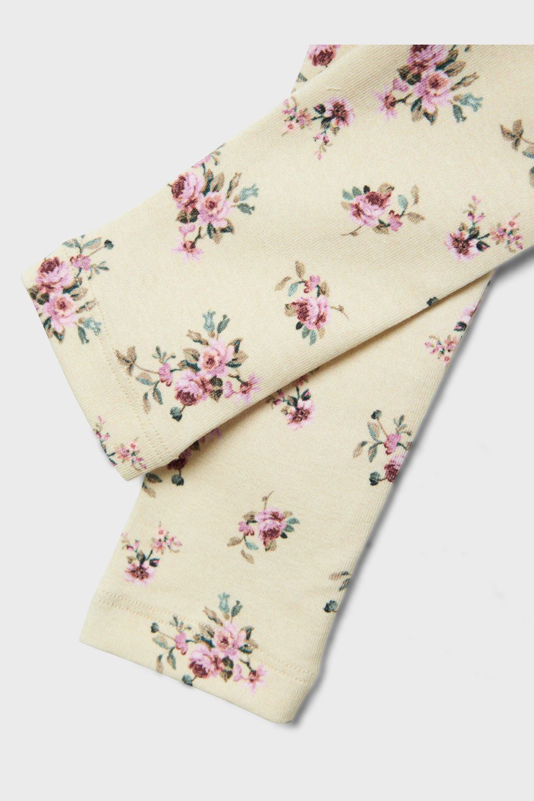 Wzór kwiatowy na jasnobeżowym tle sprawia, że legginsy łatwo łączą się z różnymi kolorami i wzorami w garderobie.