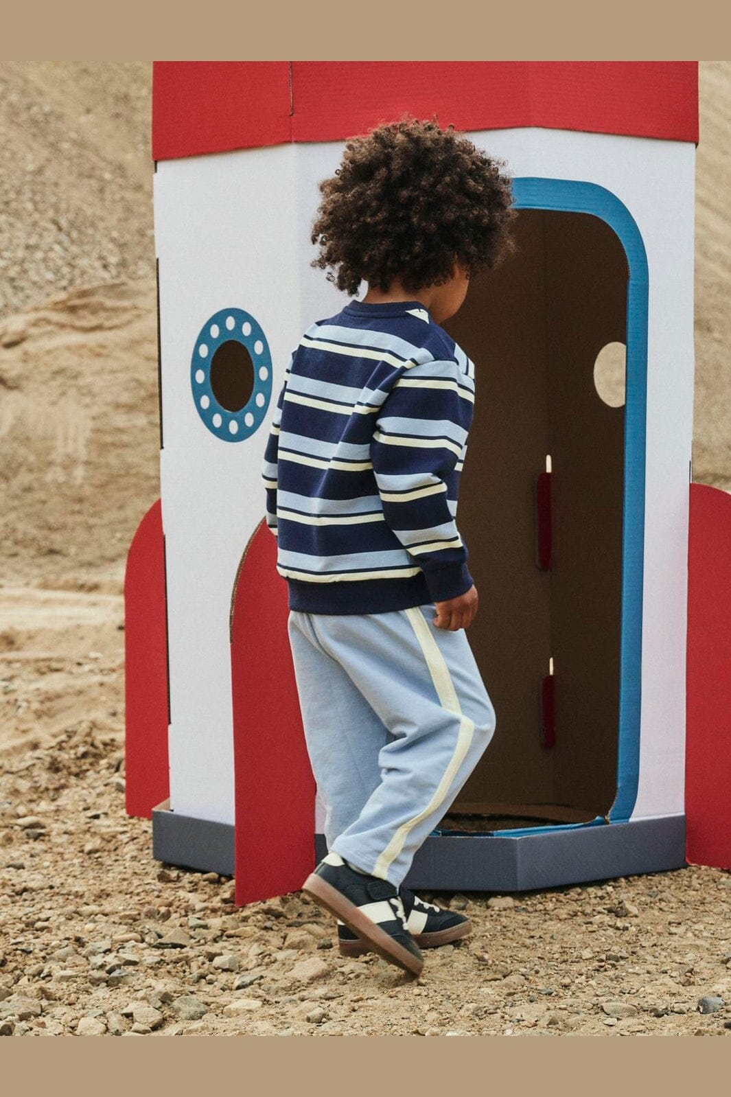 Pasiasta bluza dresowa Name It w kolorze granatowym, jasnoniebieskim i kremowym. Poziome pasy nadają bluzie stylowy charakter.