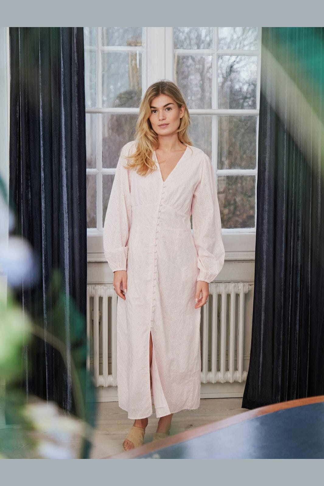 Różowa sukienka marki Neo Noir, wykonana w 100% z bawełny w jakości broderie anglaise. Sukienka ma pełny, haftowany wzór oraz dekolt w kształcie litery V.
