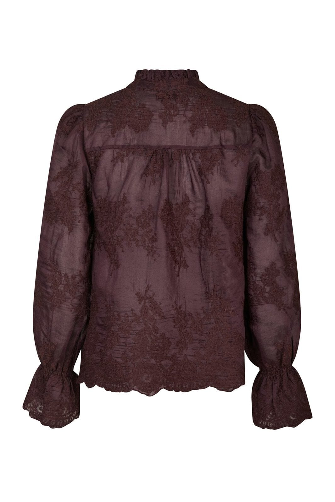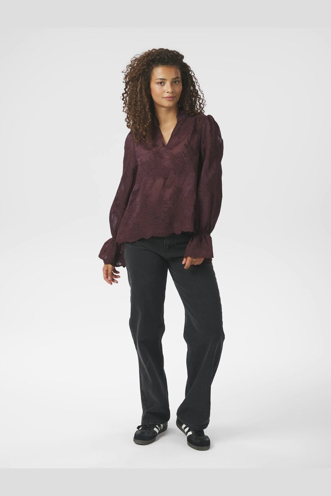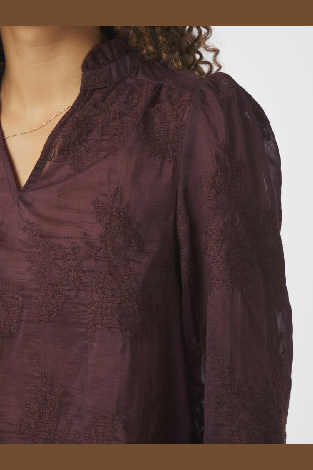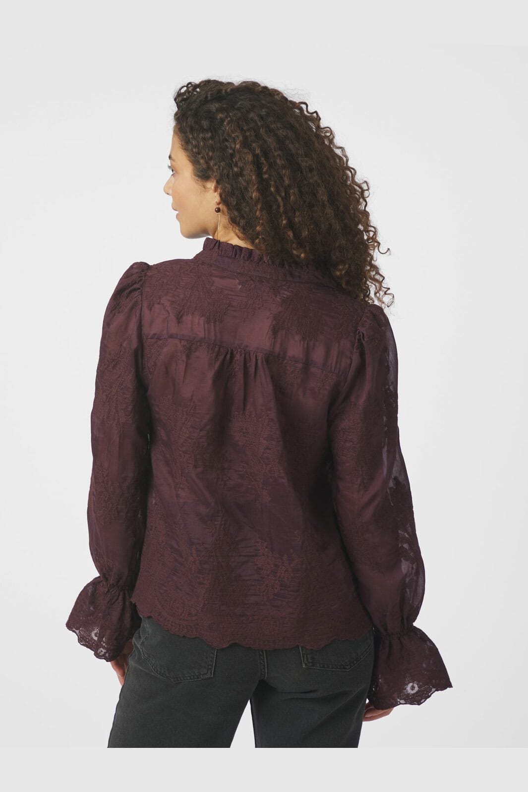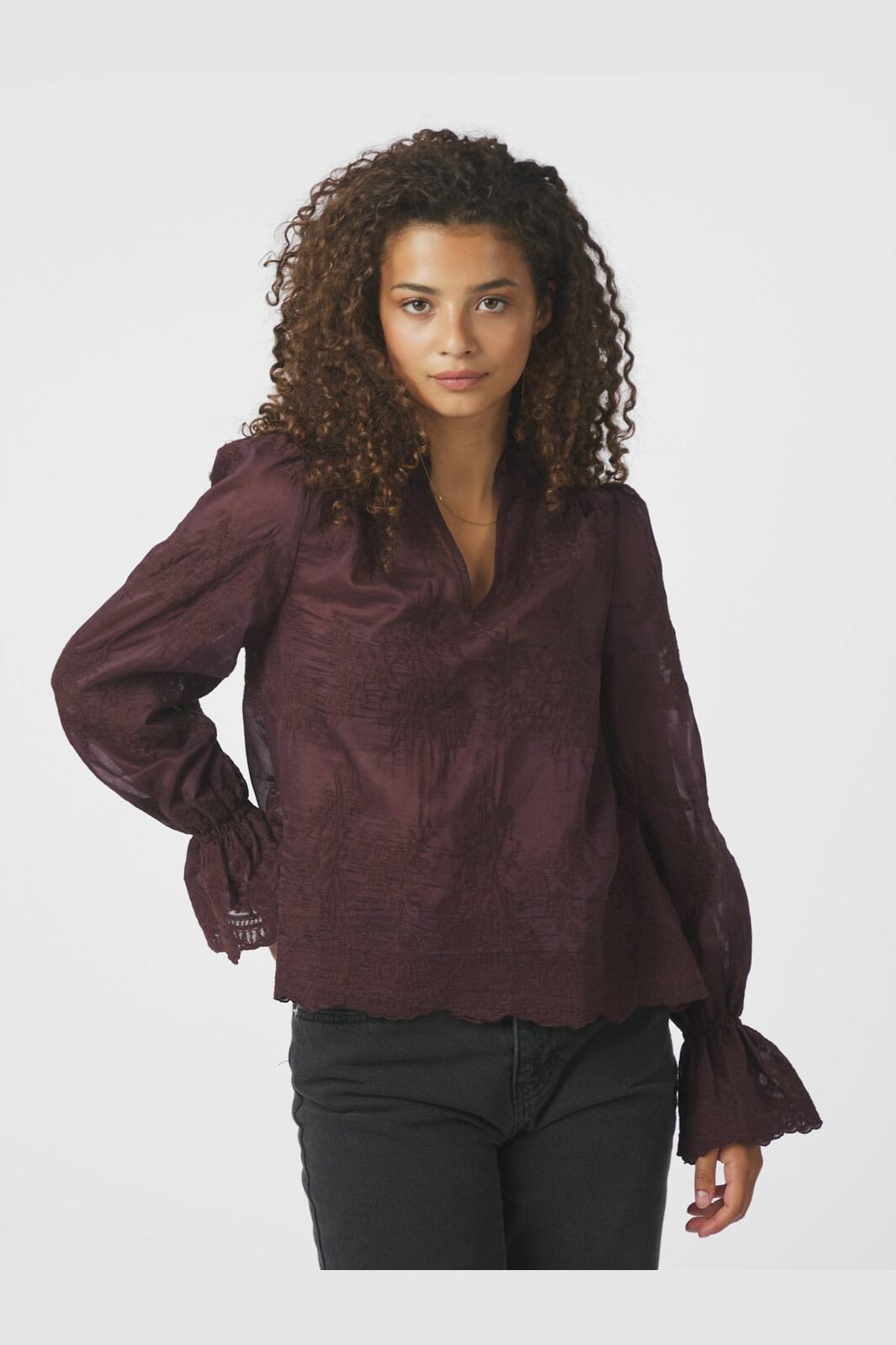 Wyhaftowana bluzka od Neo Noir w głębokim burgundowym kolorze. Bluzka ma kwiatowy wzór haftu na całym materiale, dekolt w kształcie litery V oraz długie rękawy z marszczonymi mankietami.