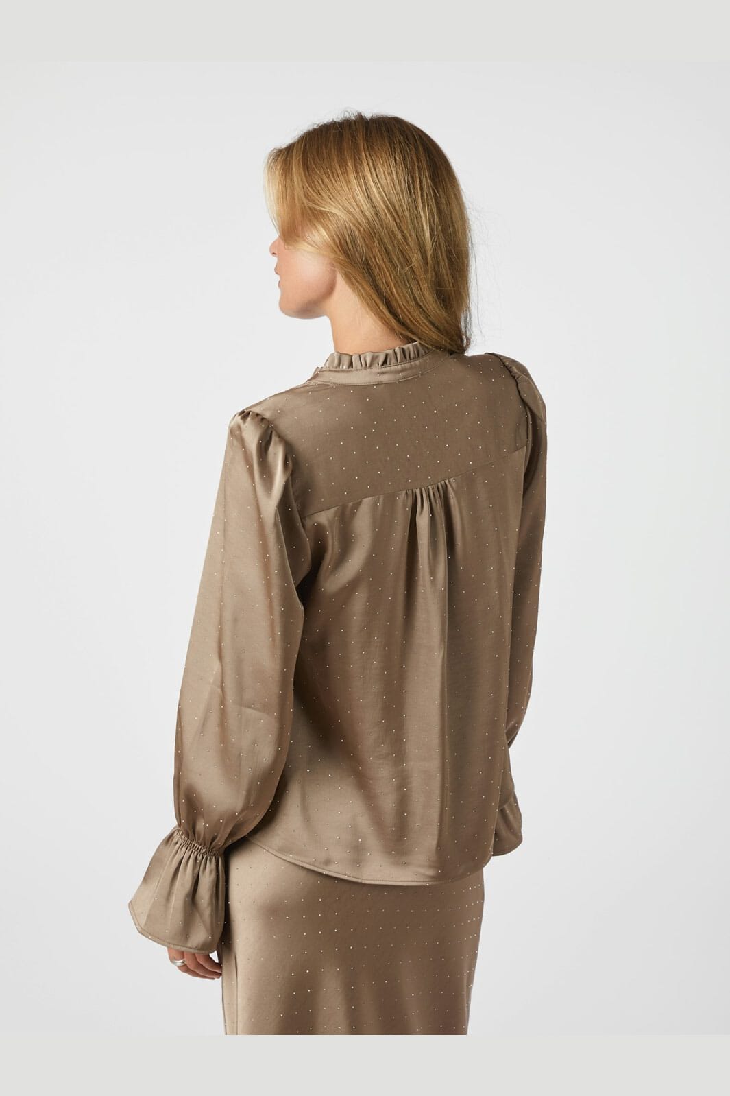 Brązowa satynowa bluzka od Neo Noir z kropeczkowym wzorem i cekinami. Bluzka ma dekolt w kształcie litery V z marszczonymi detalami oraz długimi rękawami z falbanami przy mankietach.