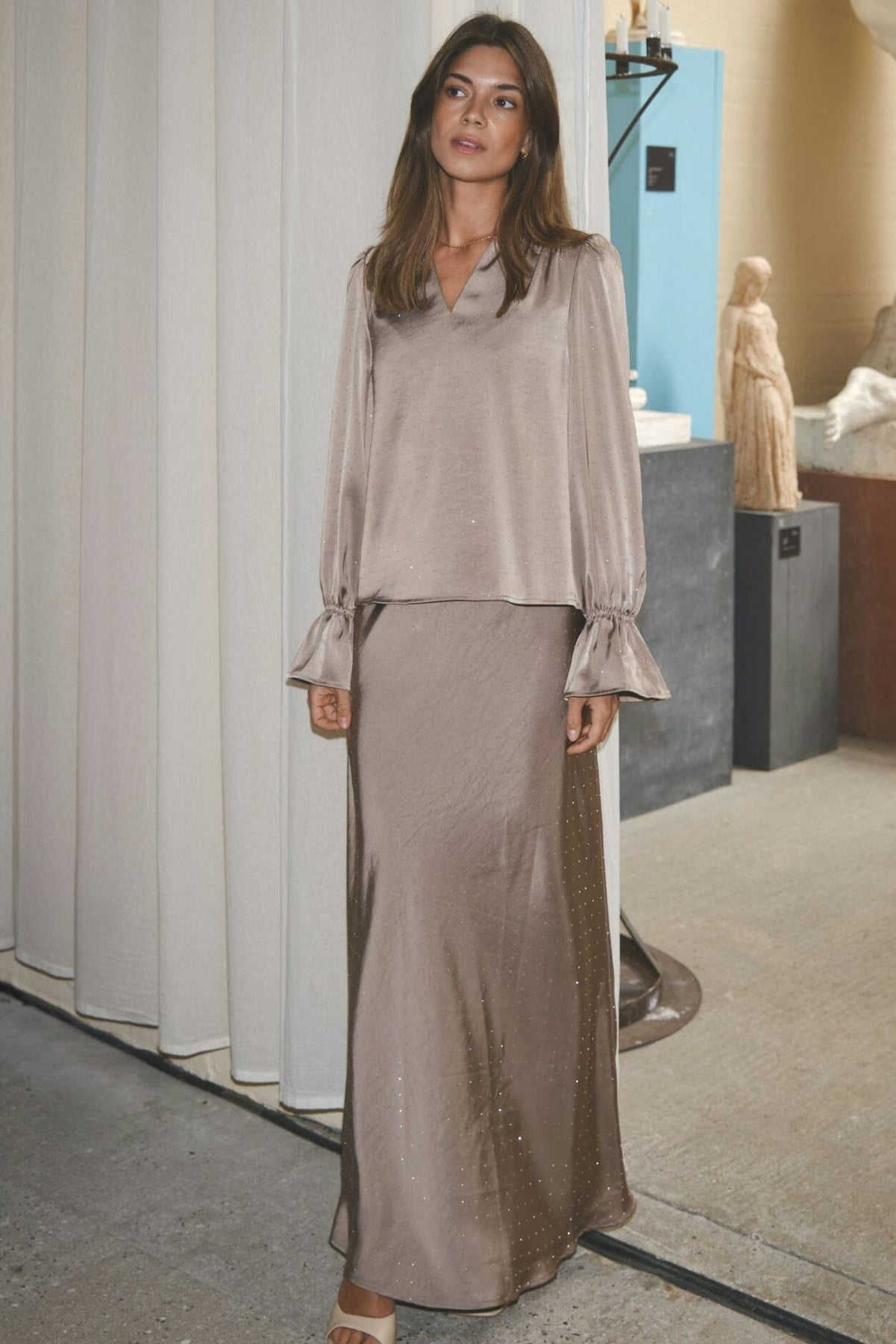 Brązowa satynowa bluzka od Neo Noir z kropeczkowym wzorem i cekinami. Bluzka ma dekolt w kształcie litery V z marszczonymi detalami oraz długimi rękawami z falbanami przy mankietach.