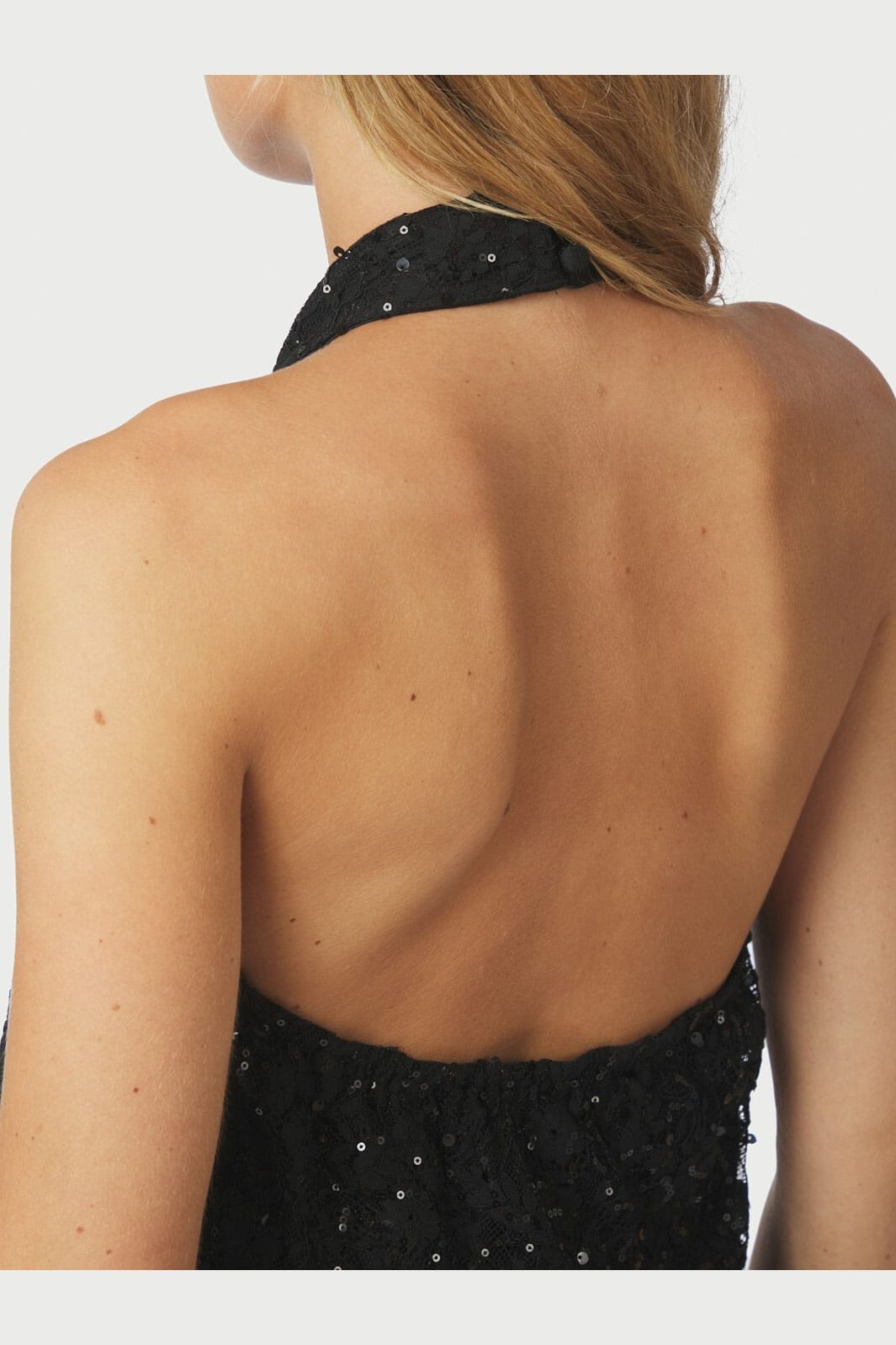 Czarna sukienka na imprezę z koronką i cekinami od Neo Noir. Sukienka ma wysoki dekolt w stylu halterneck i odkryty tył. Dopasowana góra przechodzi w zwiewny dół.