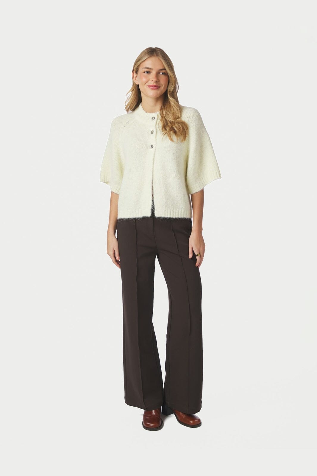 Jasnożółty kardigan dzianinowy od Neo Noir z miękkiej, puszystej dzianiny. Kardigan ma luźny krój z szerokimi rękawami 3/4 i guzikami z przodu.