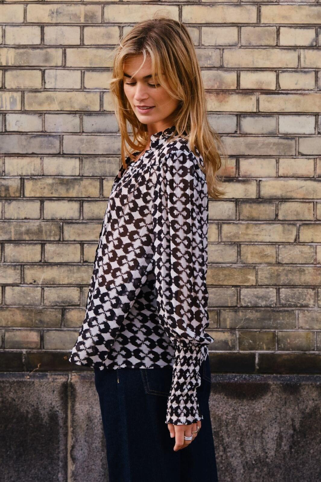 Czarna bluzka od Neo Noir z graficznym czarno-białym wzorem. Bluzka z dekoltem w kształcie V i długimi rękawami, którą można stylizować zarówno z dżinsami, jak i spódnicą.